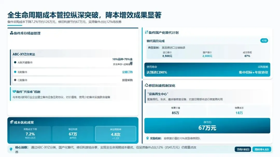 采购成本优化推行备件"国产化替代"计划,对进口备件进行技术评估,在确保性能前提下实施国产替代。全年完成替代项目43项,如将某品牌进口主轴轴承(单价8,500元)替换为国产优质品牌(单价2,800元),使用寿命达到进口的90%,但成本降低67%。通过集中招标、年度协议价、以量换价等方式,备件采购成本同比下降7.2%,节约金额达126万元。