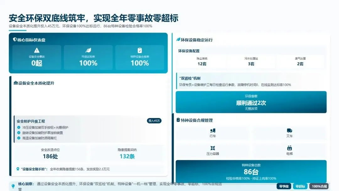 | 安全环保 | | 设备安全事故0起,环保设备同步运行率100%,隐患整改率100% | |