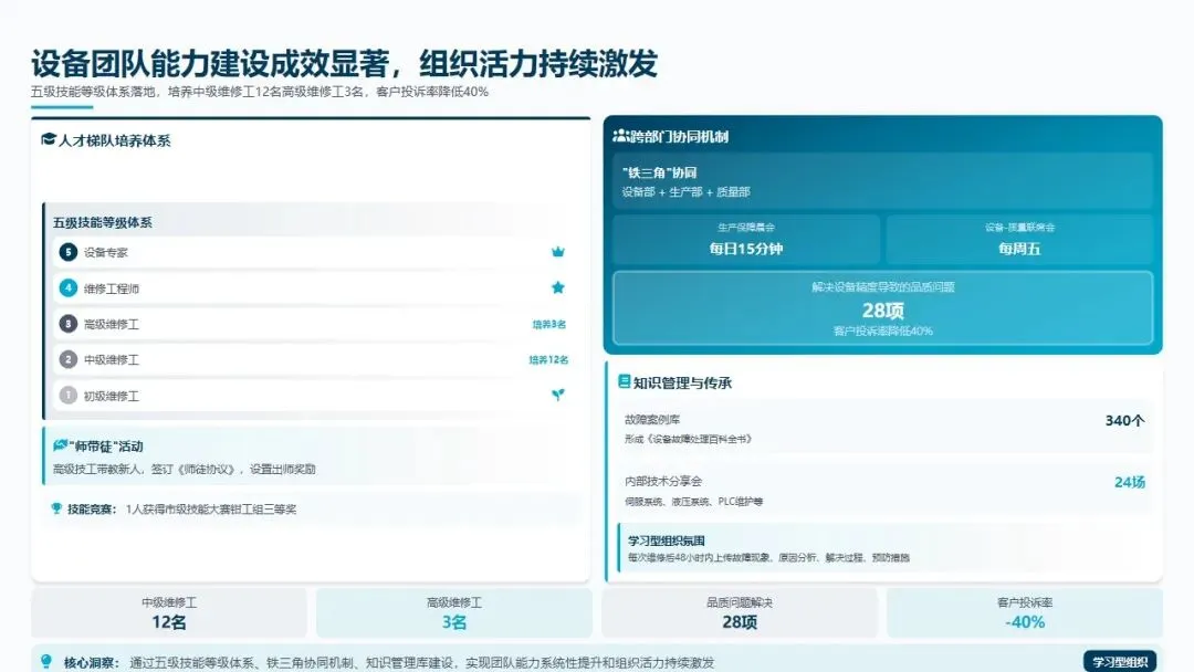 跨部门协同机制打破部门墙,建立设备部与生产部、质量部的"铁三角"协同机制。每日召开"生产保障晨会"(15分钟),快速解决前日设备问题,部署当日重点。每周五召开"设备-质量联席会",分析因设备导致的品质异常,全年解决设备精度导致的品质问题28项,客户投诉率降低40%。