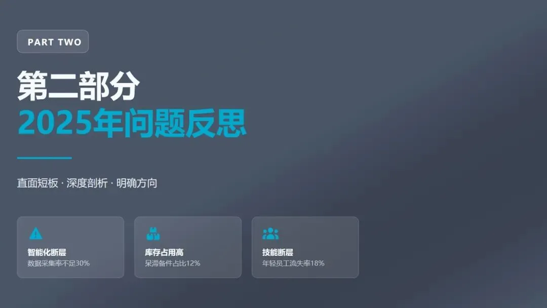 2025年,设备管理部在挑战中实现了设备指标的全面突破,在数字化转型、预防性维护、成本管控等方面取得了阶段性成果。但我们也清醒认识到,设备智能化水平、队伍能力建设、前期管理等方面仍存在明显短板。