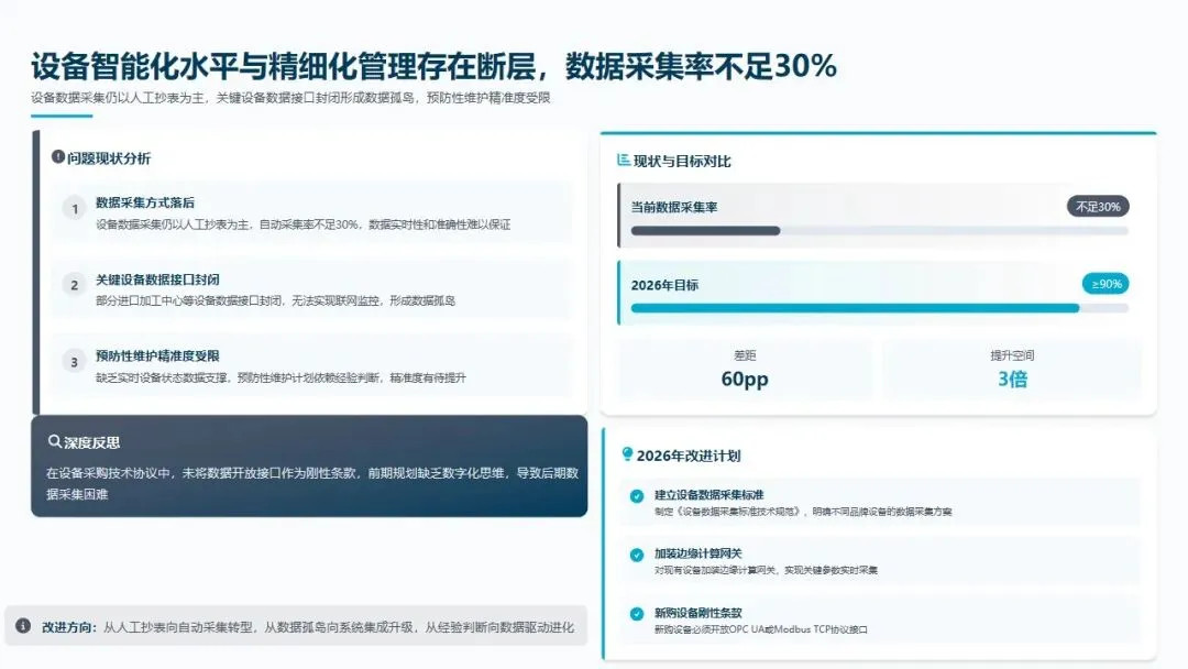 改进计划:2026年建立设备数据采集标准,新购设备必须开放OPC UA或Modbus TCP协议接口;对现有设备加装边缘计算网关,实现关键参数实时采集,目标数据采集率达到90%以上。