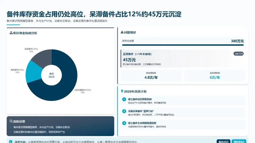 改进计划:2026年建立备件动态预警机制,结合生产计划预测备件需求;实施呆滞备件"清零行动",通过内部调剂、供应商回购、二手市场处置等方式盘活资金;建立备件生命周期管理流程,设备报废时同步处置专用备件。