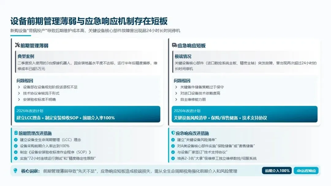 改进计划:2026年建立"关键设备风险清单",对A类设备的核心部件实施"保险储备"或"寄售储备";与设备厂家签订"技术支持协议",确保重大故障时4小时内远程响应、48小时内到场;培养2-3名能独立维修数控系统、伺服系统的"大拿"级维修工。