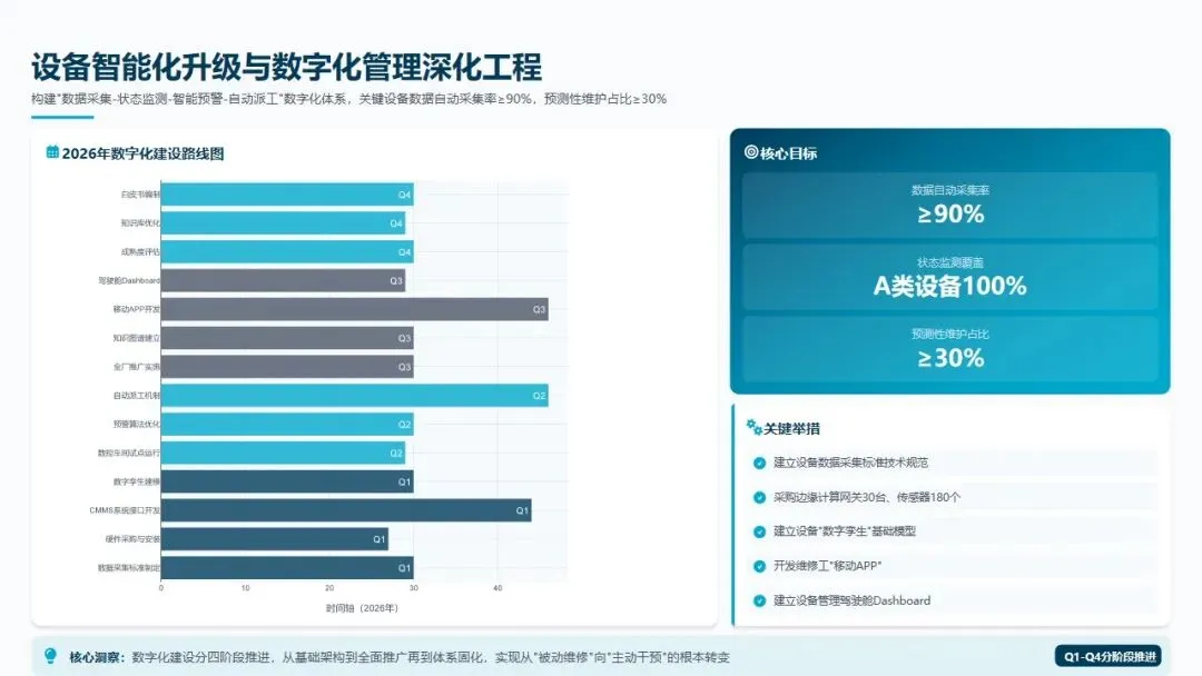 12月份:编制《2026年设备数字化管理白皮书》,总结全年数字化建设经验;制定2027年数字化深化方案(如引入AR远程协助维修、设备维护机器人等);确保全年设备突发故障率降低40%,预测性维护占比达到30%。