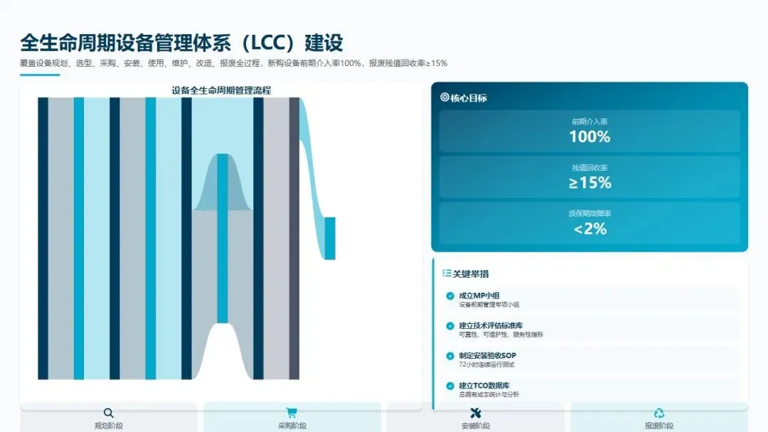 总体目标:建立覆盖设备规划、选型、采购、安装、使用、维护、改造、报废全过程的管理体系,实现设备全生命周期成本最优,新购设备前期介入率100%,设备报废残值回收率≥15%。