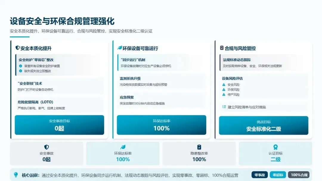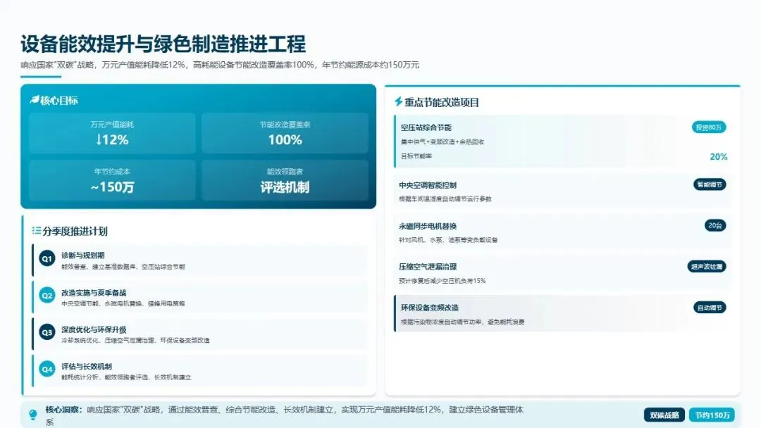 总体目标:响应国家"双碳"战略,降低设备能耗与排放,实现万元产值能耗降低12%,高耗能设备节能改造覆盖率100%,建立绿色设备管理体系。
