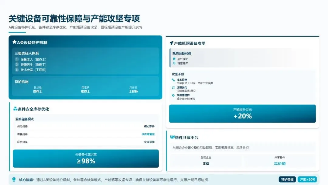 A类设备特护机制对42台A类关键设备实施"特护管理",每台设备指定"设备主人"(操作工)、"健康医生"(维修工)、"技术专家"(工程师)三级责任人。建立A类设备"日点检、周维护、月分析"机制,每周召开特护会议分析设备状态。