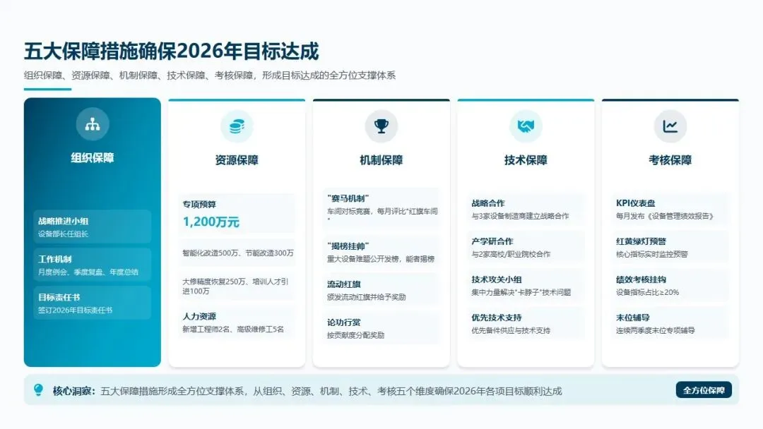 成立设备管理部战略推进小组,由设备部长任组长,各车间设备主任、专业工程师为成员,建立"月度例会、季度复盘、年度总结"工作机制。明确各模块责任人,签订《2026年目标责任书》,将目标分解到季度、到月、到岗位。