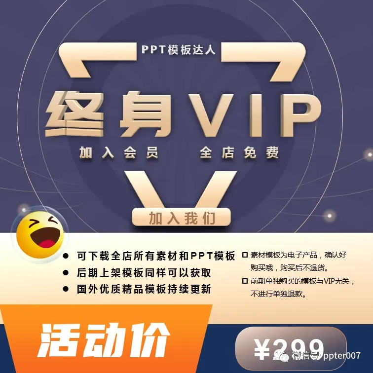 ● 加入会员可免费获取本店所有模板和素材,包括以后上架更新内容,购买后加入VIP微信群,享受后续服务,可指导使用店内模板。● 目前已有模板价值已经超过2000元,并将持续更新,第一时间获取国外最新、最炫酷的PPT模板。● 免费获取多门内部PPT视频教程,从入门到精通都有,还有高级动画课程,让你快速提升PPT水平,走上PPT副业之路。 👇👇👇