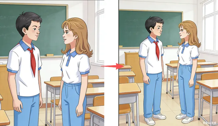 嗨,大家好,这里是学窝铺子,一个专注分享有用、能用、好用的知识和技能的地方。这年也过完了,可能是春节晚会机器人节目的作用,有些小伙伴后台留言,咨询一些PPT和AI之间的问题。今天就把我压箱底的PPT 邪修法掏出来 —— 不用复杂插件、不用花冤枉钱,直接把 AI 变成你的24 小时私人素材助手,从此素材自由、效率拉满。如果你是老师做课件,人教版(2024 新版)七年级上册英语 预备单元 1(Starter Unit 1 Hello!)第 1 页(S1/P1)上的人物,有固定的头像和形象,但是书上没有出现正脸全身照,如果我们需要正脸人物照,我们该怎么办呢?首先,把教材上的两幅图截图下来,先把每张图片扩大。然后,发给豆包,输入指令“将两张图合并,图片正脸朝前,去掉背景和书包,保留人物手势姿势”,就生成了下图右边的全身照。在合图的时候,如果生成的图片不符合要求,我们继续向豆包输入指令,逐步调整。一张“拆家专业户”与卡通宇航员的图,给豆包输入指令“将两张图合并,形成一个宇航狗狗,姿势保持飞行状态”。上面我们是图片拼凑成自己需要的图,那做课件难免需要一些场景图,我们采用同样的方式,输入合适的指令,最后得到的就是标准的课件素材。同样是把两个单独图片的人物,提交给豆包,输入指令“生成这两位同学在教室里交谈的图片”,就得到了下图,我们再放在自己的课件中,是不是很应景啊。教材截图、网上找图大多数都是有背景的,放进PPT就成了块状效果,让我们的页面又土又乱,可是,我们又不会PS、也不会安装插件啊,现在AI时代,“一句话”的是搞定。具体操作:给豆包上传图片,发送指令“把这张图的背景彻底去掉,只保留人物 / 物品,边缘干净,透明底导出”。一秒变透明PNG,随便叠底色、做排版,课件瞬间高级。用图“财富”自由。截图、搜图经常会遇到图片半身、截图缺一块、排版留白不足等问题。对于会PS图片编辑的来说简单,但对于咱这非专业人员,这又得仰仗AI了,用AI扩图,自动不全违和。具体操作:上传残缺图,发送指令“把这张图向外扩展,保持画风一致,不要改变原有主体,补全成完整构图”你就说,这是不是“刚需”吧,有了这招,再也不用怕半截图了,也不用为拉伸变形、画质模糊犯愁了。拿到一张图,有人举手、有人叉腰,课件风格乱跳。为了统一画风,AI直接调整姿势。具体操作:上传目标图片+参考姿势图,输入指令“让左边人物保持脸部不变,换成右边的姿势,画风统一、比例正常”。这5招PPT+AI邪修法,不用插件、不花钱、不费脑,把豆包变成了你的24小时私人素材助手,找图快、抠图净、拼图准、扩图稳……从此做课件,你就是那个最“靓”的仔,更是那个效率大师,素材自由、颜值在线、版权完全。当然,还有很多“绝招”有待挖掘,评论区您也可把自己会的、好的分享出来。