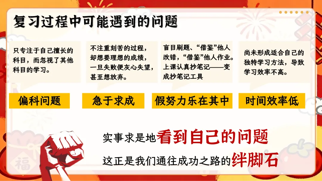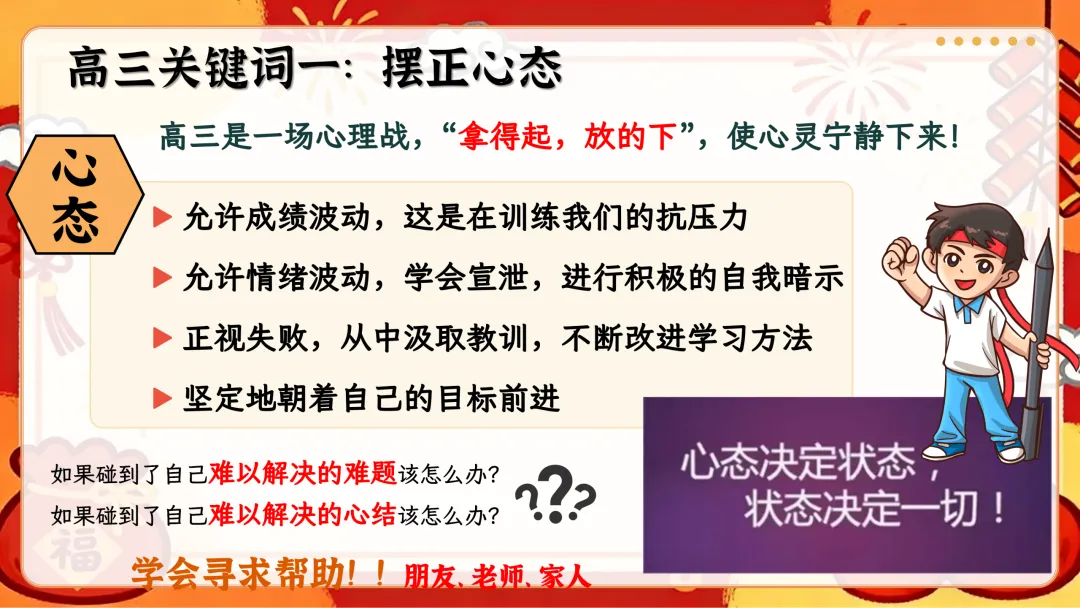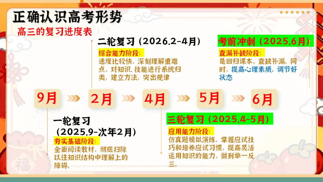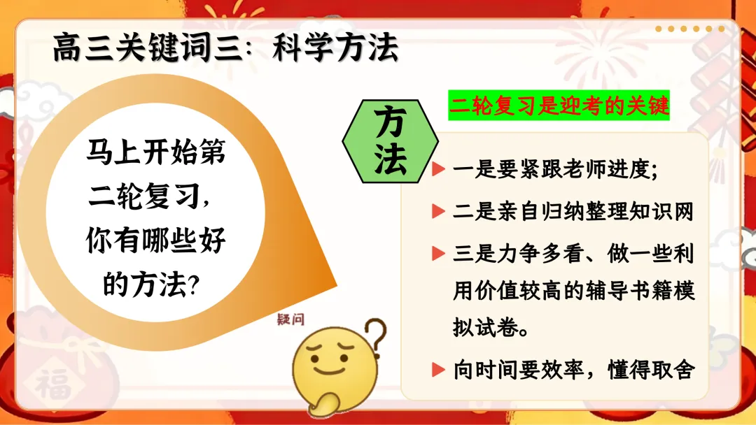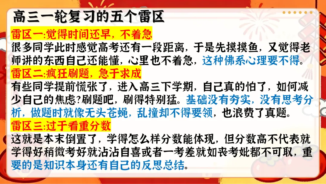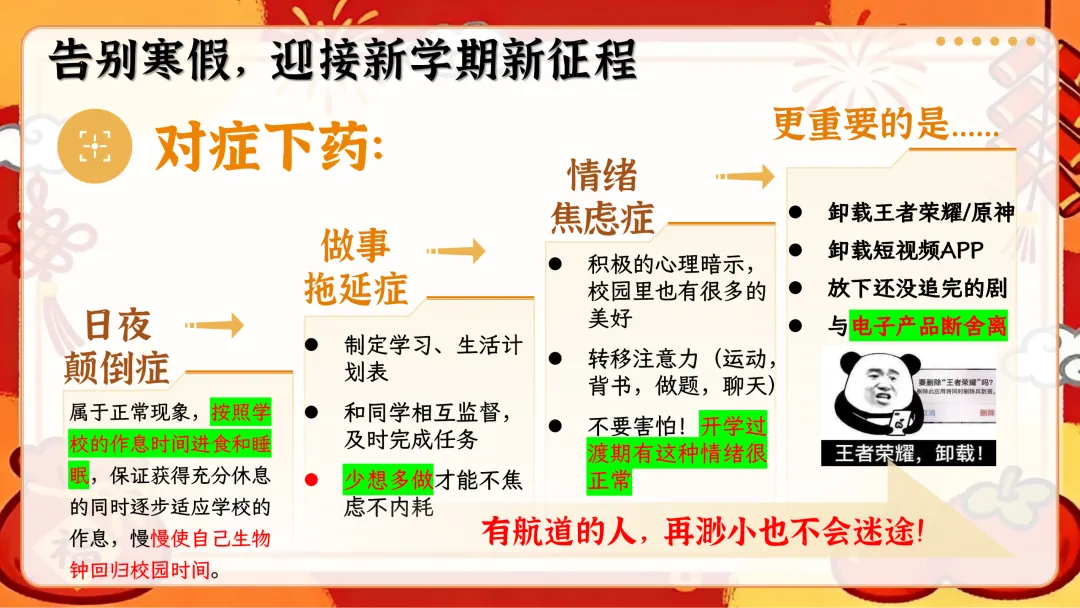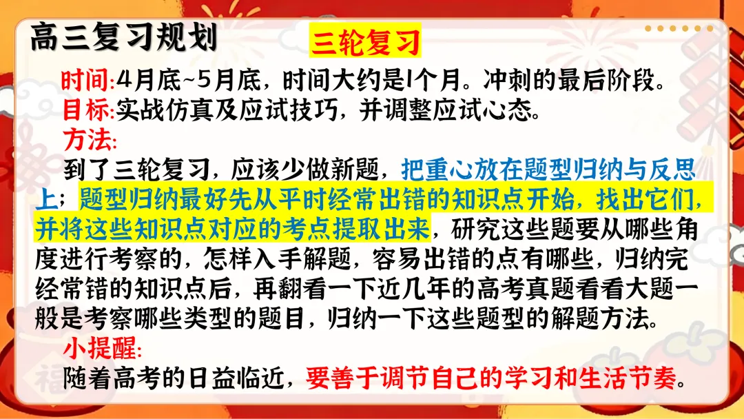 开篇从寒假回顾切入,用趣味表情包直击开学综合征,给出收心归位的具体方法,帮学生快速告别假期状态,回归校园学习节奏;接着直面高考形势,梳理三轮复习规划,结合近年高考报名数据、本省分数线和一分一段表,让学生清晰认知备考差距;