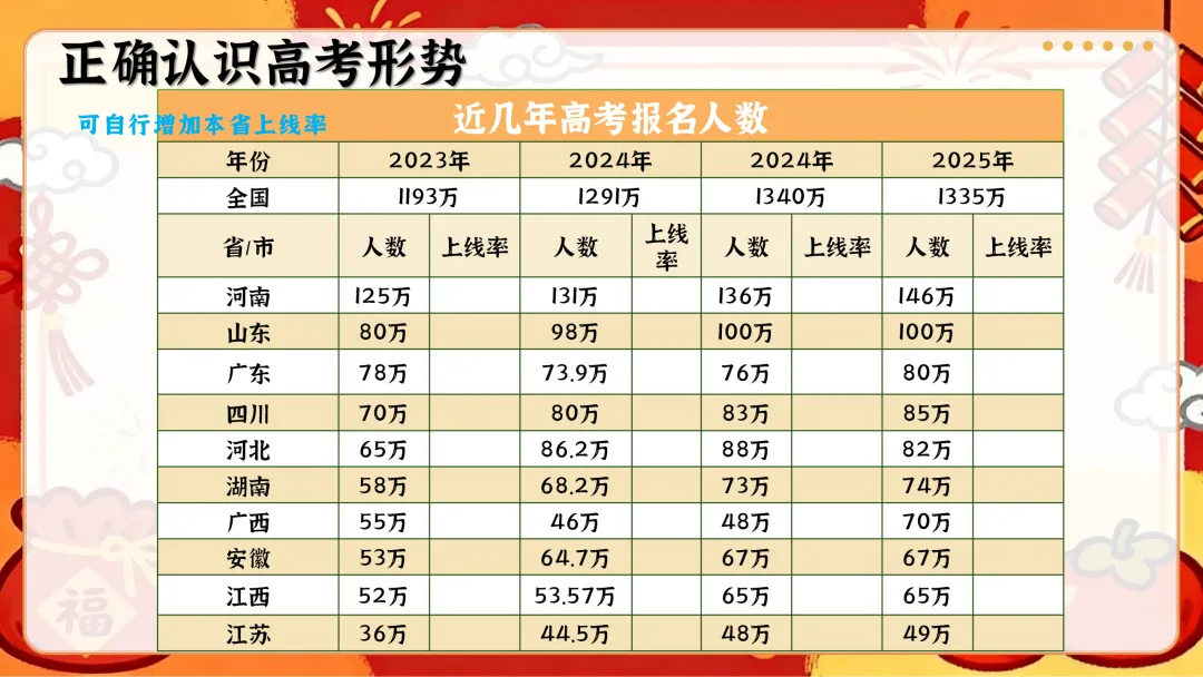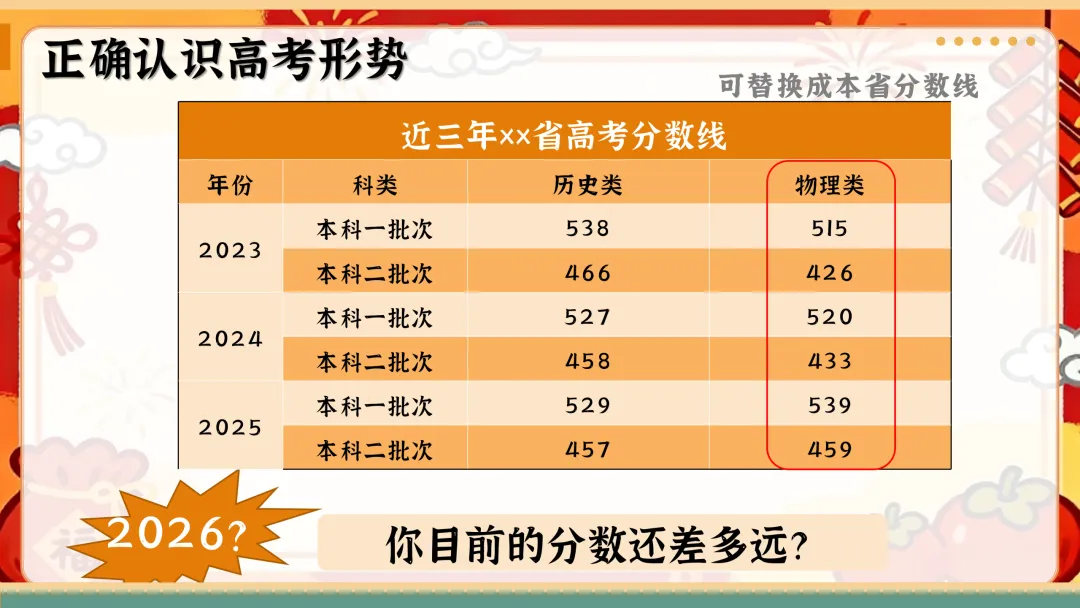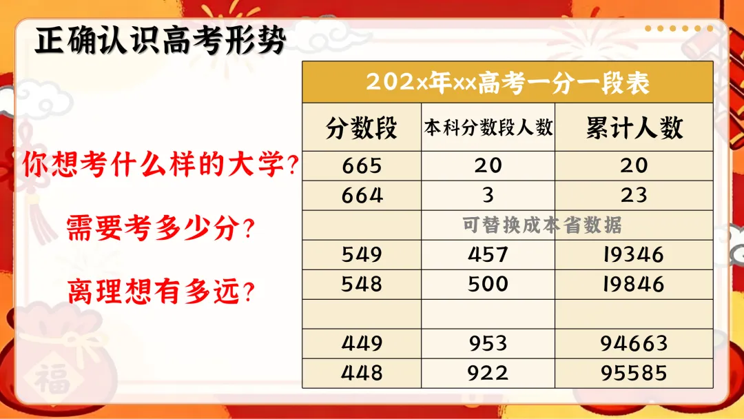 每个板块都预留可编辑空间,可根据本校、本班学情替换省份数据、调整内容,适配高三春季开学第一课主题班会ppt课堂使用。