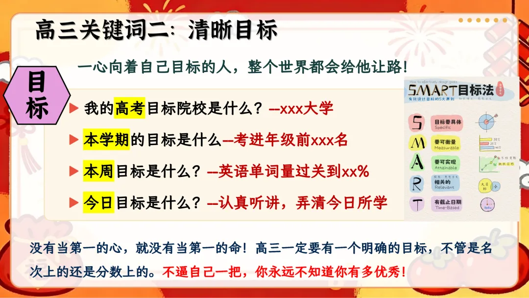 整套 PPT 内容逻辑清晰,既有高考形势的理性分析,又有备考方法的实操指导,还有励志话语的情感激励,搭配趣味图片、数据表格、实用模板,图文并茂不枯燥。