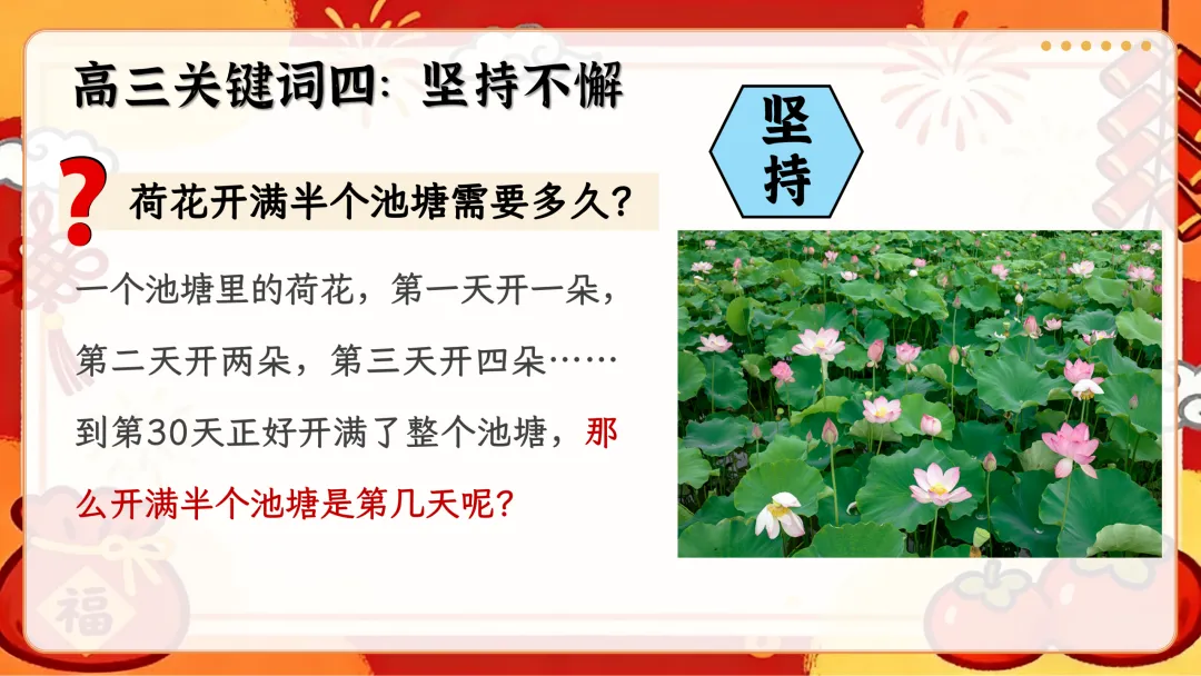 随后以脚踏实地为核心,讲解高三备考的心态、目标、方法等关键要素,用荷花效应等案例激励学生坚持到底;最后重申班级纪律,共筑班风,为高考冲刺营造良好氛围。