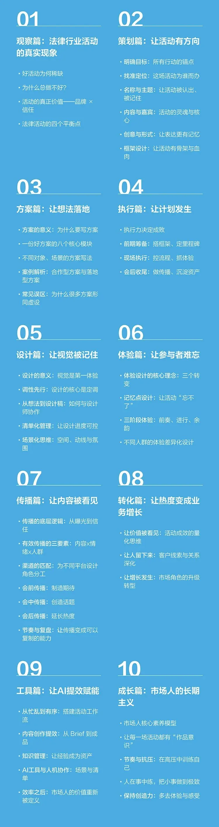这些细节看起来都很小,却几乎贯穿了法天使这些年举办活动时最重要的判断逻辑,也充分体现在了《“独一无二”的活动——法律行业市场品牌实战手册》这本新书里。