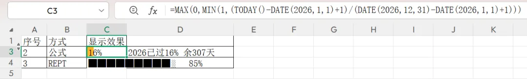 ="2026已过"&TEXT(MAX(0,MIN(1,(TODAY()-DATE(2026,1,1)+1)/(DATE(2026,12,31)-DATE(2026,1,1)+1))),"0%")&" 余"&MAX(0,DATE(2026,12,31)-TODAY())&"天"