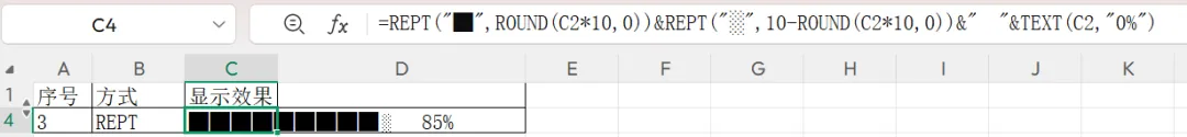 -- 将C2的百分比(如0.3)乘以10并取整(结果为3),决定显示多少个实心方块 █。