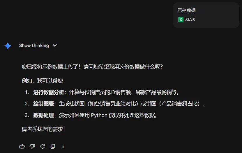 对于复杂的数据分析任务,我们推荐使用Gemini 3.1 Pro大语言模型。作为专为Web端设计的付费层级高阶模型,Gemini 3.1 Pro支持极长的对话上下文,并具备卓越的代码解释能力。该模型能够直接读取电子表格文件,通过自主编写Python代码来精准完成底层数据的清洗与建模工作。相比于传统的人工操作,这种方式打破了由于公式不熟悉或代码门槛导致的技术瓶颈。