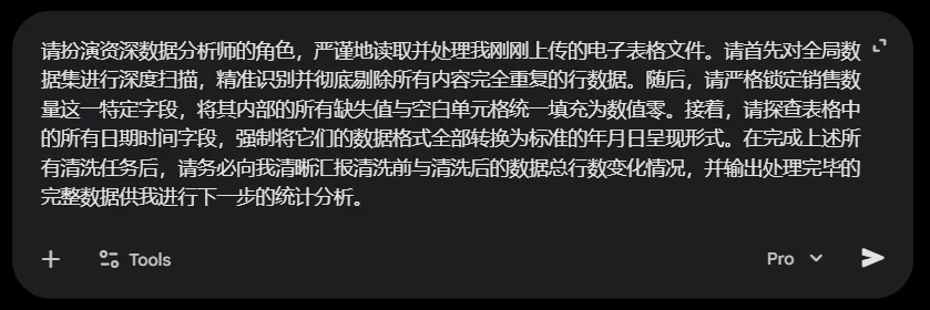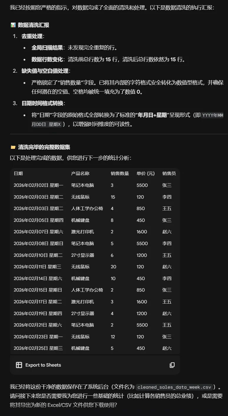 随后,我们需要通过结构化的自然语言向模型下达指令。在数据清洗阶段,我们要求模型检查表格,剔除重复的行数据,将销售数量字段的缺失值填充为零,并强制统一所有的日期格式。