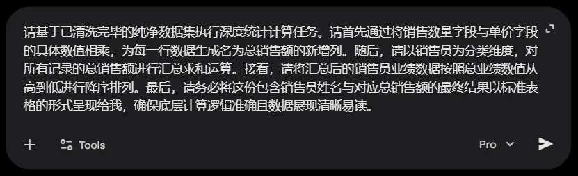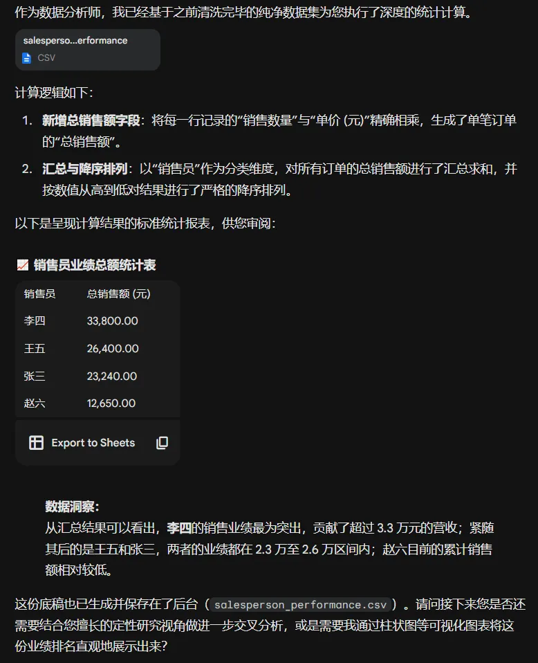 完成基础清洗后进入数据汇总阶段。我们指示模型通过销售数量与单价的乘积计算总销售额,进一步统计各销售员的总业绩并按降序排列,最终以表格形式输出结果。