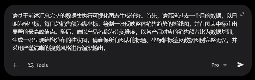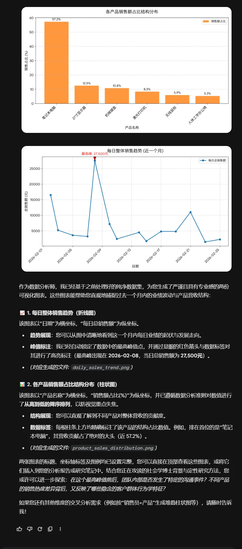 在可视化分析环节,我们引导模型生成反映过去一个月每日总销售额趋势的折线图,以及呈现不同产品销售占比的柱状图。