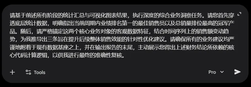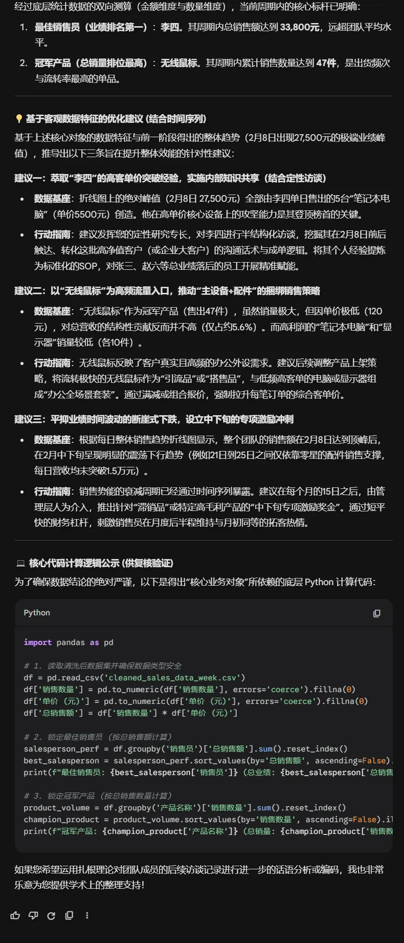 最后,在深度洞察阶段,我们要求模型基于前述统计结果指出最佳销售员与最畅销产品,并基于客观数据特征提出提升销售效能的建议。为确保输出结果的准确性,我们在每一步都明确告知模型分析目标,并分阶段输入指令,同时对涉及核心财务数据的代码计算逻辑进行人工校对。