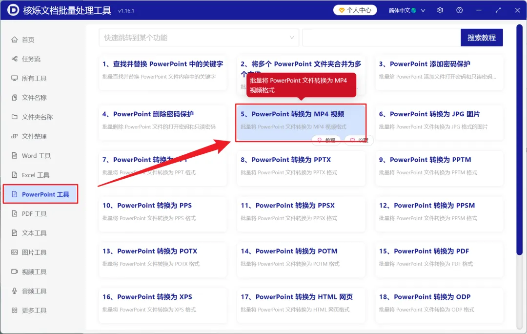 1、打开【核烁文档批量处理工具】,选择【PowerPoint 工具】-【PowerPoint 转换为 MP4 视频】。