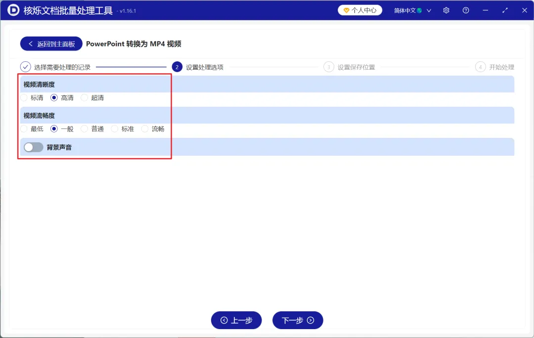 3、进入设置界面,这里清晰度可以选择标清、高清或超清,流畅度可以选择最低、一般、普通、标准或流畅,同时也可以打开背景声音添加音频文件作为视频的背影音,确定后最后点击下一步。接着点击浏览,选择好新文件的保存位置。