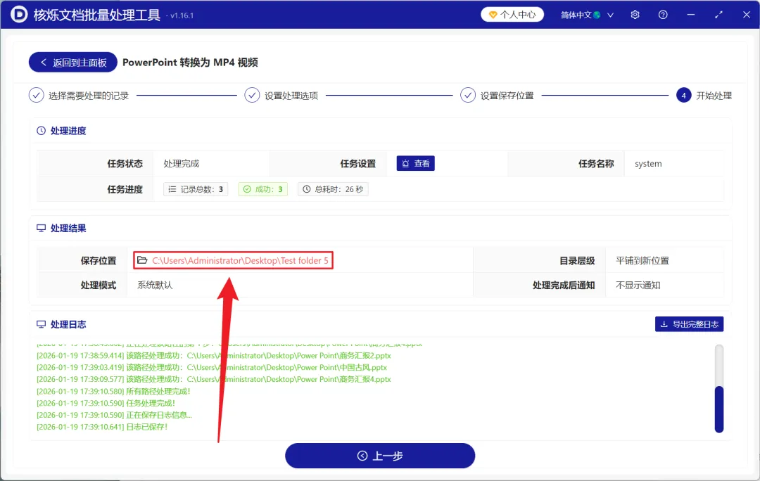 4、等处理结束之后,点击红色路径打开文件夹即可查看转换成功的 MP4 视频。