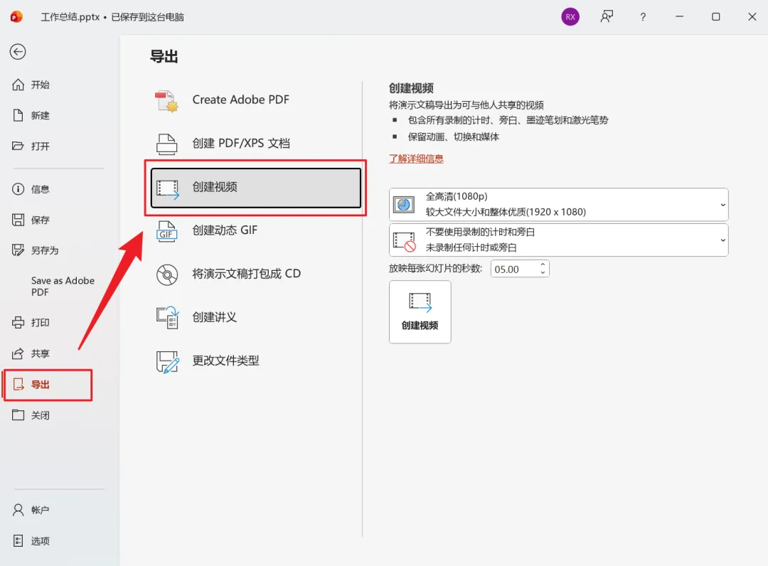 方法二:使用 PowerPoint 内置功能将文件转换为视频