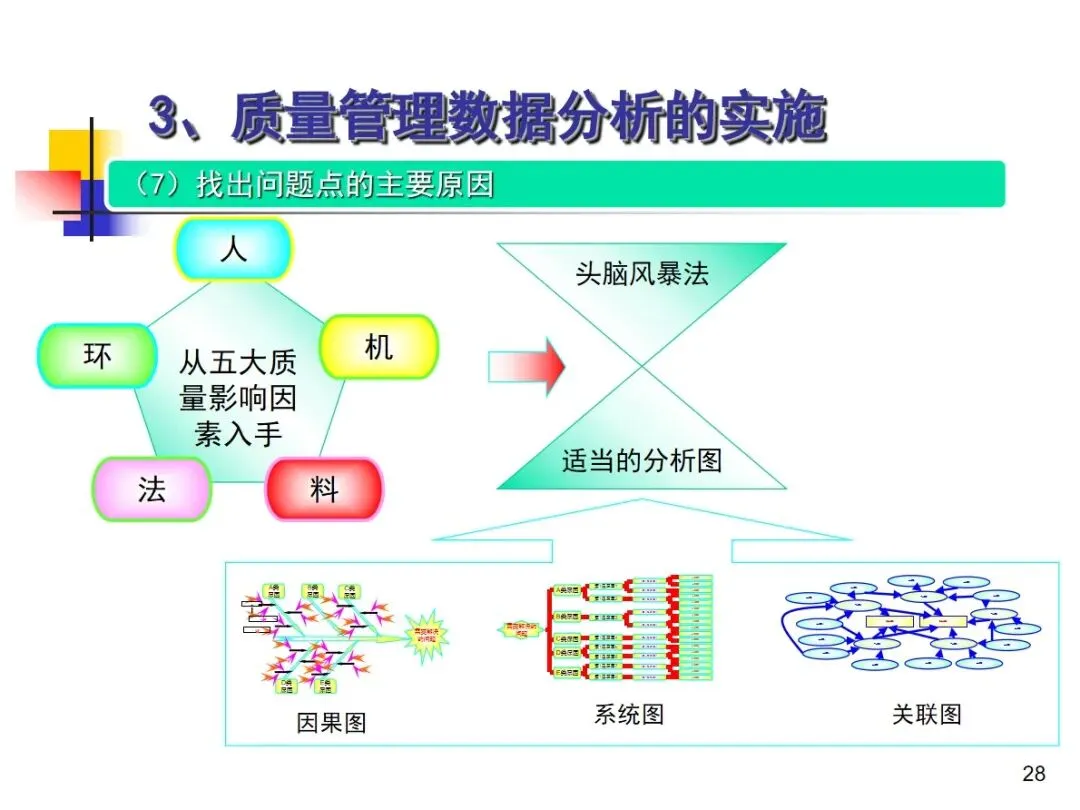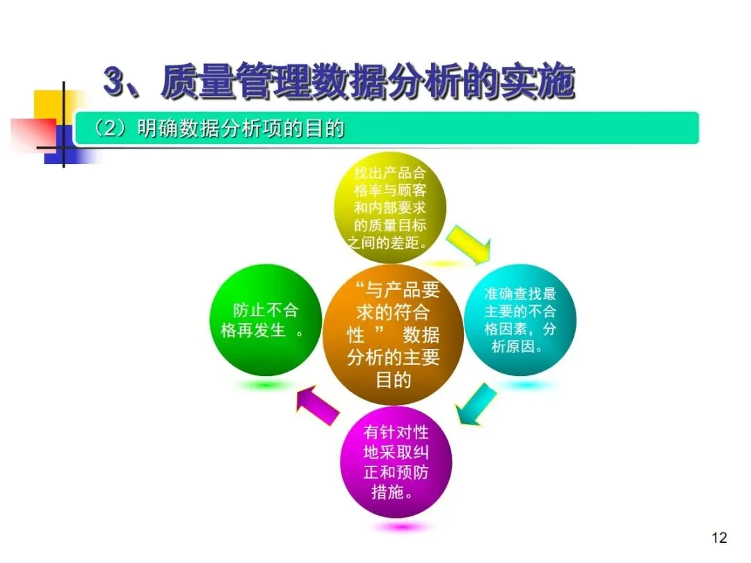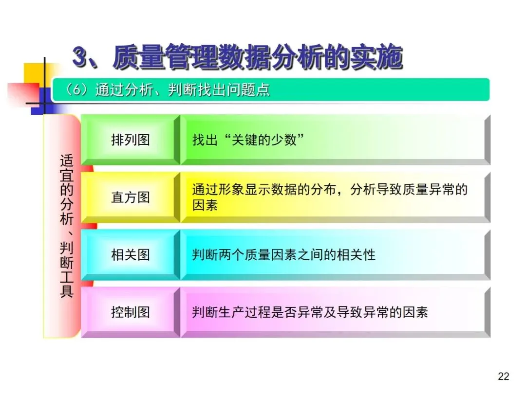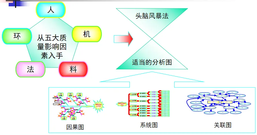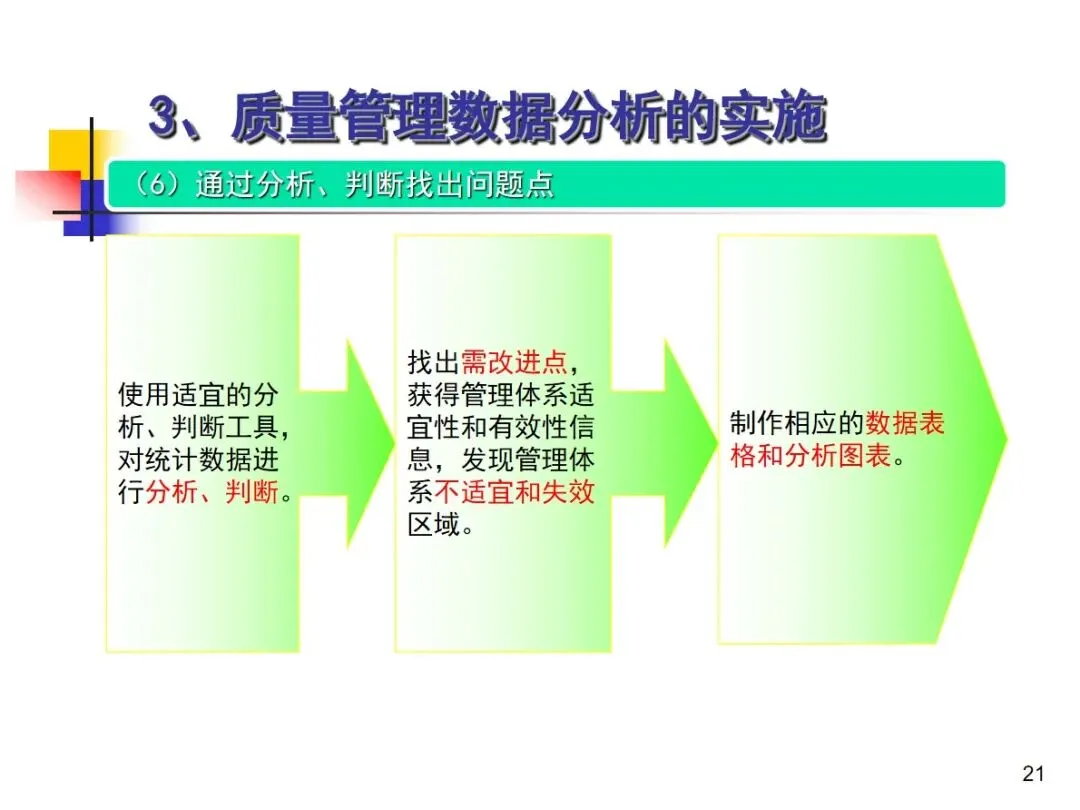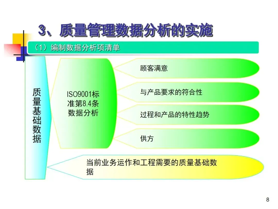 数据分析的实施主要集中在顾客满意度、产品符合性、过程与产品特性和趋势、供应商管理等四个核心方向上,每个方向都有具体的分析对象。数据采集应遵循客观、真实的原则,使用有效的计量器具在现场采集测量数据,调查资料应具有一定的代表性和代表性。对问题点的分析可以灵活地使用排序图,直方图,相关图,控制图等工具来准确地找出问题的关键所在;从人,机,料,法,环这五个要素出发,运用因果关系图,系统图等分析工具,追溯问题的根源,不浮于表面,最少问3-5个“为什么”。
