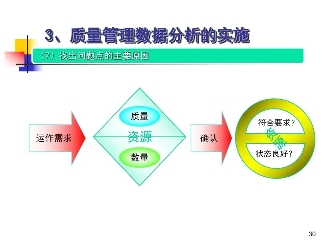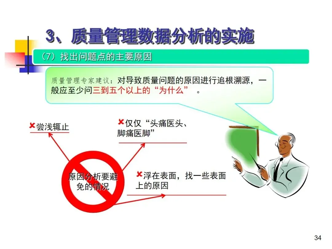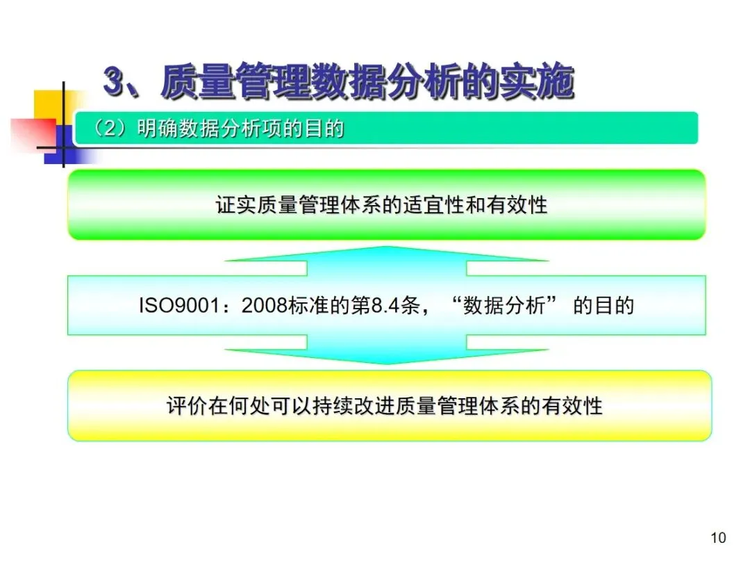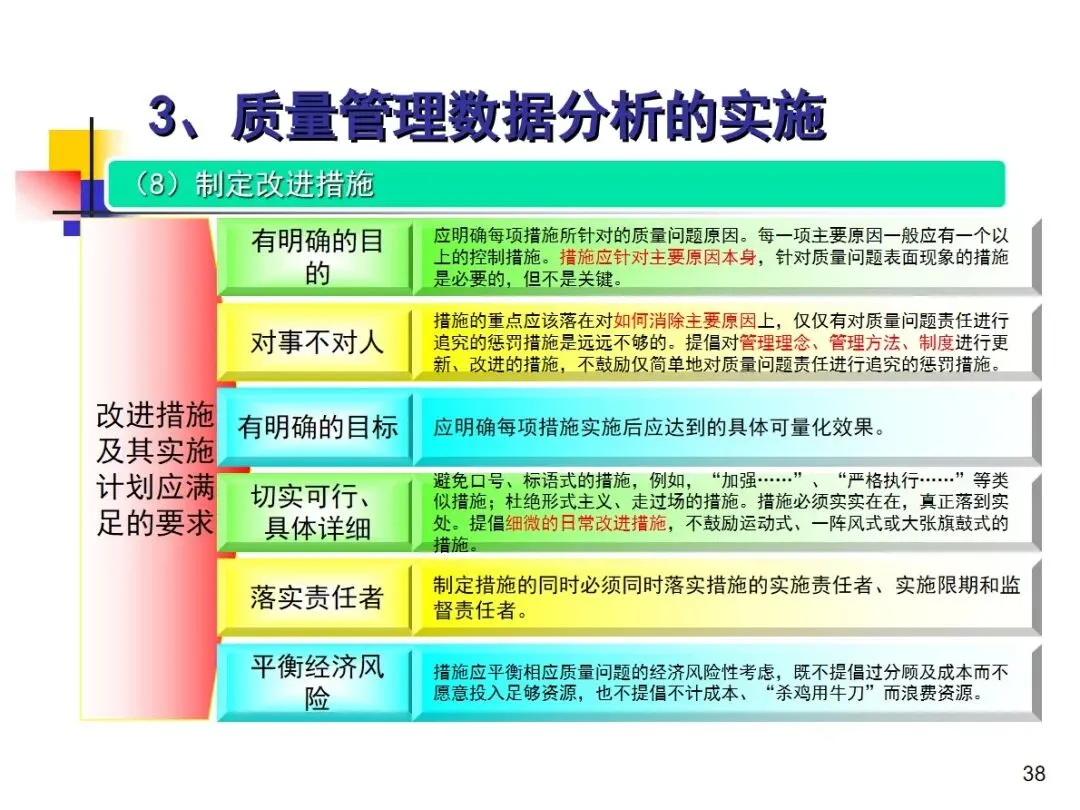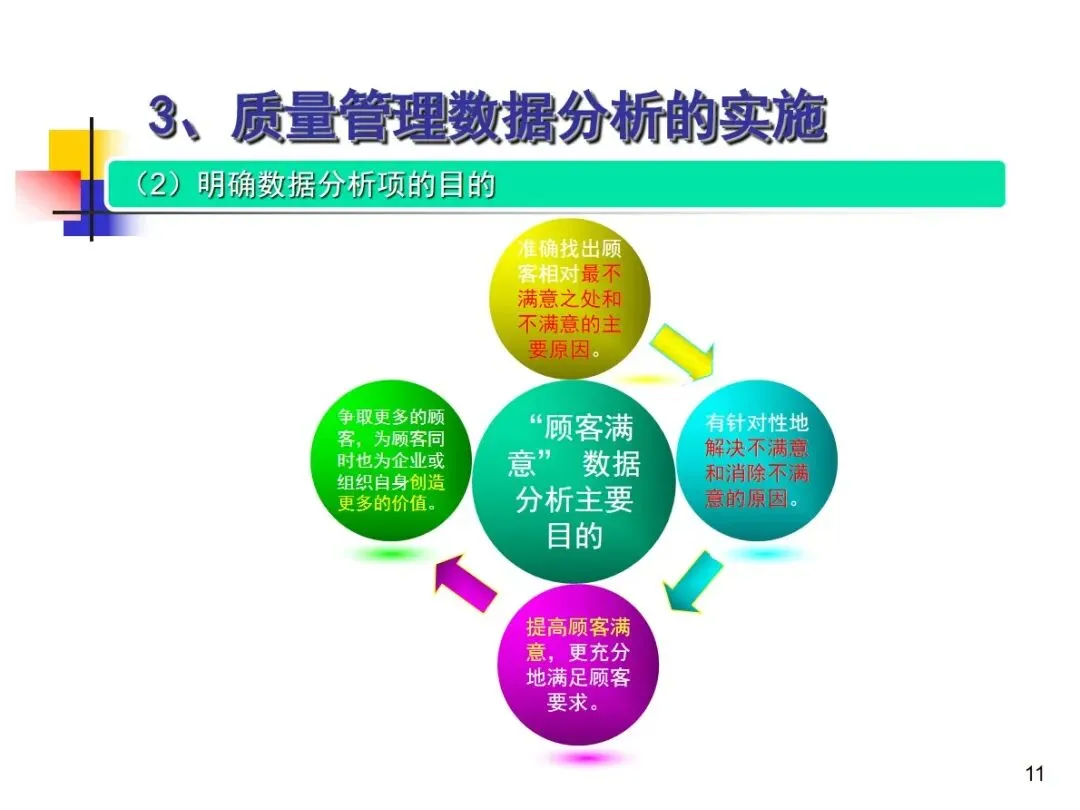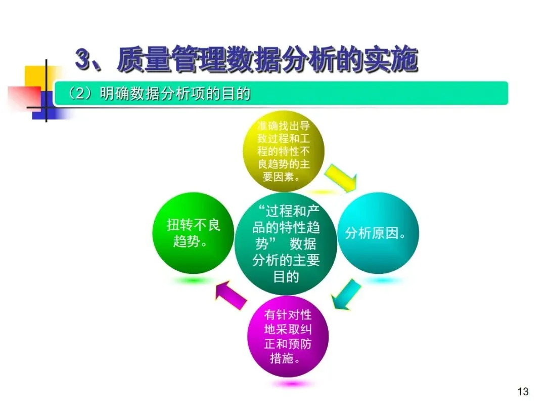 数据分析的实施主要集中在顾客满意度、产品符合性、过程与产品特性和趋势、供应商管理等四个核心方向上,每个方向都有具体的分析对象。数据采集应遵循客观、真实的原则,使用有效的计量器具在现场采集测量数据,调查资料应具有一定的代表性和代表性。对问题点的分析可以灵活地使用排序图,直方图,相关图,控制图等工具来准确地找出问题的关键所在;从人,机,料,法,环这五个要素出发,运用因果关系图,系统图等分析工具,追溯问题的根源,不浮于表面,最少问3-5个“为什么”。