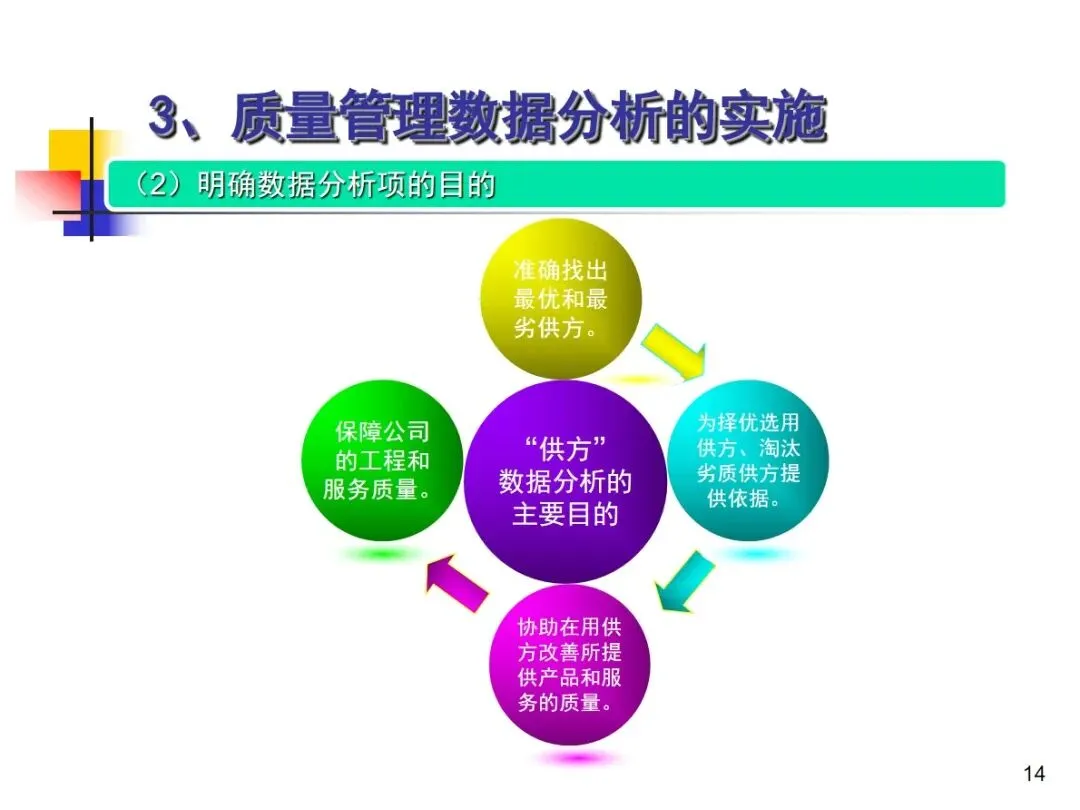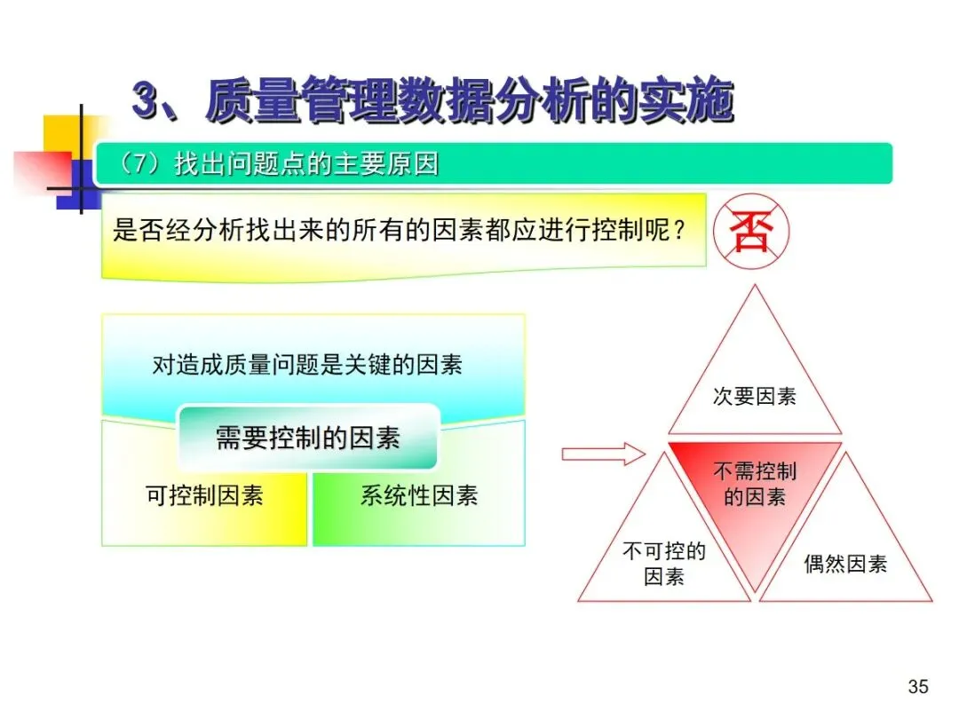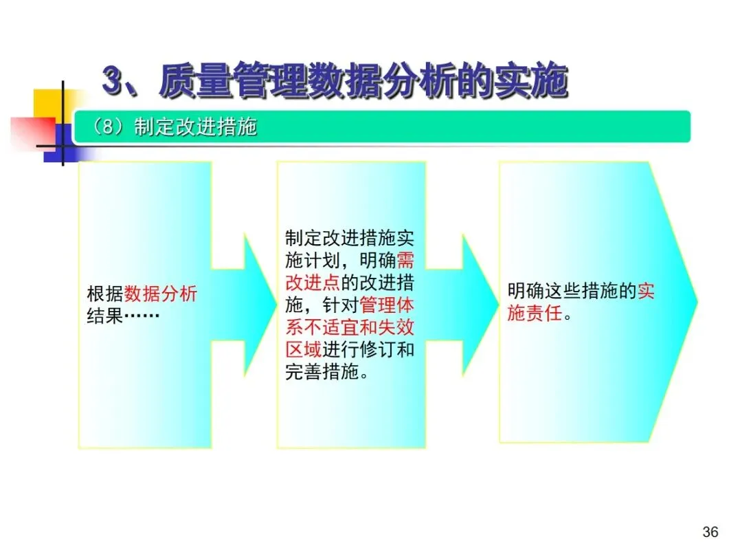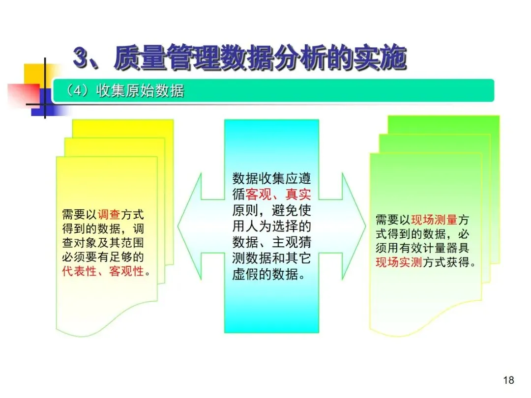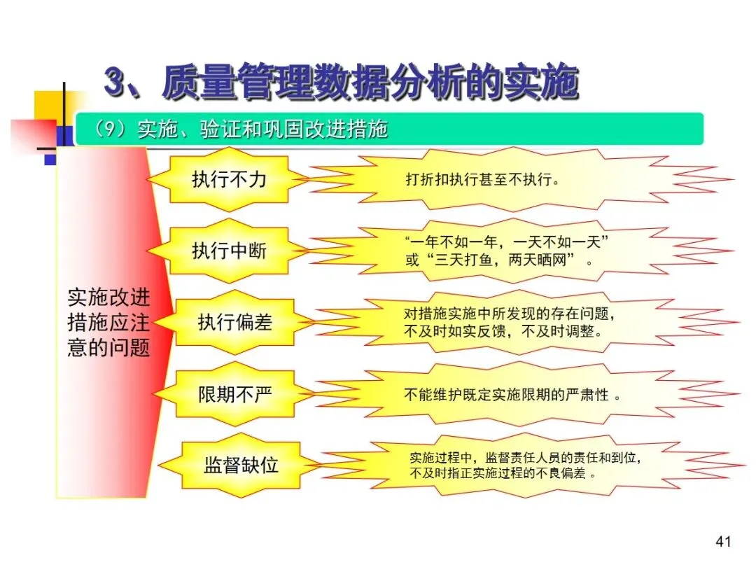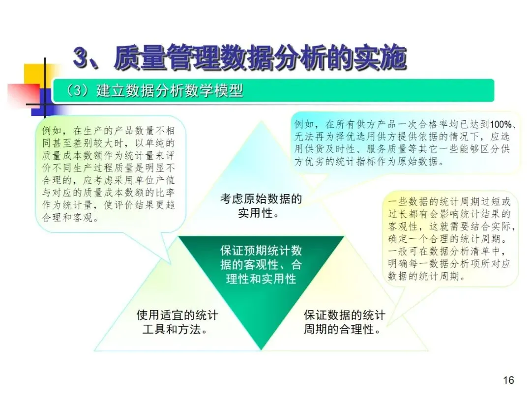 数据分析的实施主要集中在顾客满意度、产品符合性、过程与产品特性和趋势、供应商管理等四个核心方向上,每个方向都有具体的分析对象。数据采集应遵循客观、真实的原则,使用有效的计量器具在现场采集测量数据,调查资料应具有一定的代表性和代表性。对问题点的分析可以灵活地使用排序图,直方图,相关图,控制图等工具来准确地找出问题的关键所在;从人,机,料,法,环这五个要素出发,运用因果关系图,系统图等分析工具,追溯问题的根源,不浮于表面,最少问3-5个“为什么”。