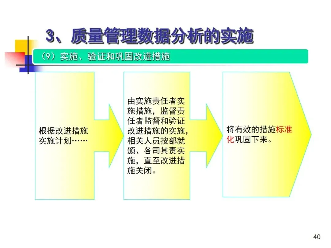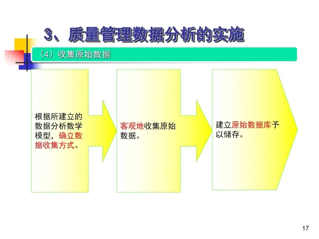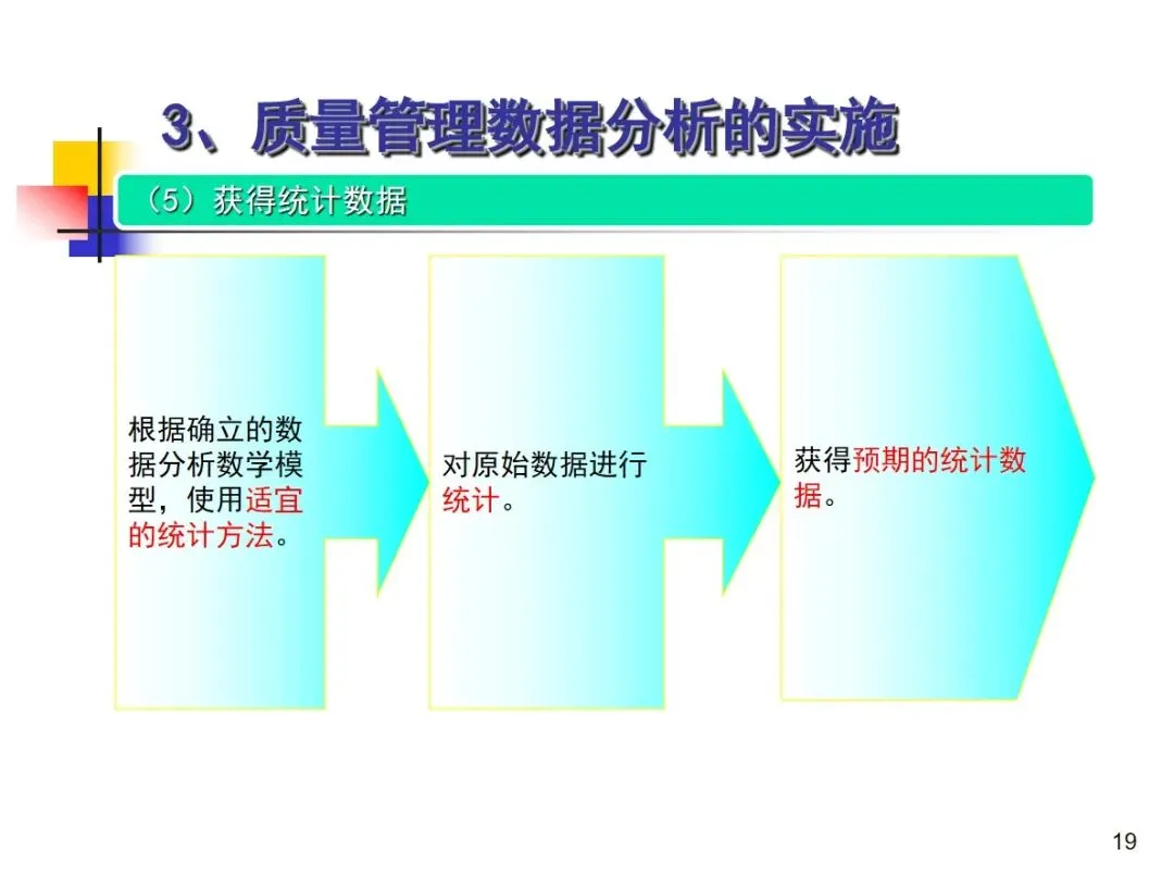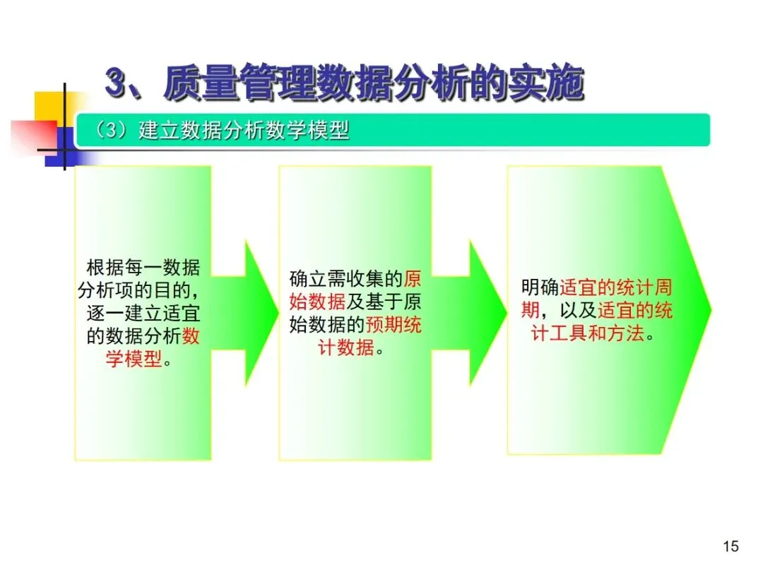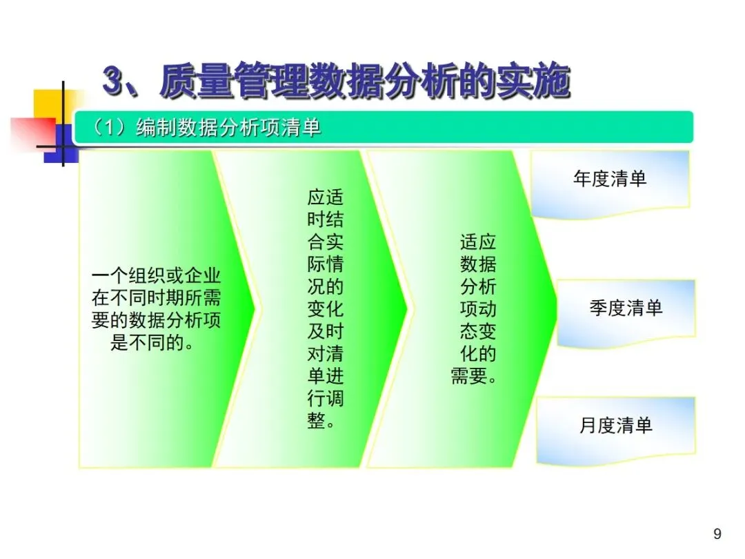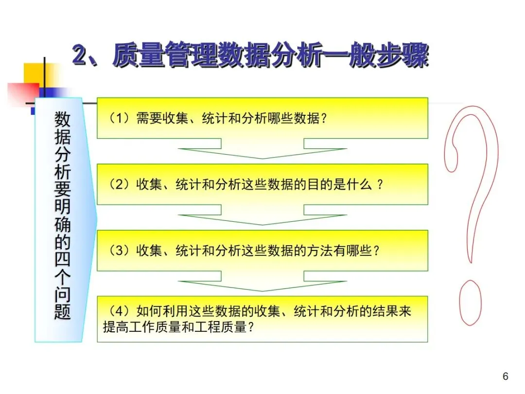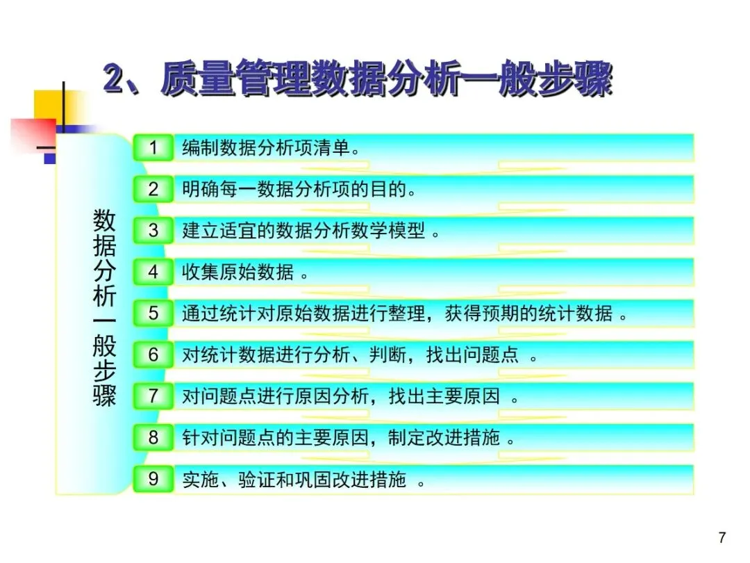 进行品质管理资料分析时,必须遵守九个标准步骤,并形成一个完整的工作循环。首先,根据企业的实际情况,编制年度、季度和月度的数据分析项目清单,根据业务的变化进行动态调整;然后,明确每个分析项目的核心目标,验证管理体系的适当性,促进持续改进,有针对性地建立数据模型进行分析。然后,严格按照模型客观采集原始数据、建立数据库保存、用统计手段进行整理得到有效的统计数据、用专业工具进行分析和判断,准确发现质量问题,深入挖掘产生问题的主要根源,制定整改方案并落实到位,最后对整改措施的效果进行验证,固化有效的整改措施。