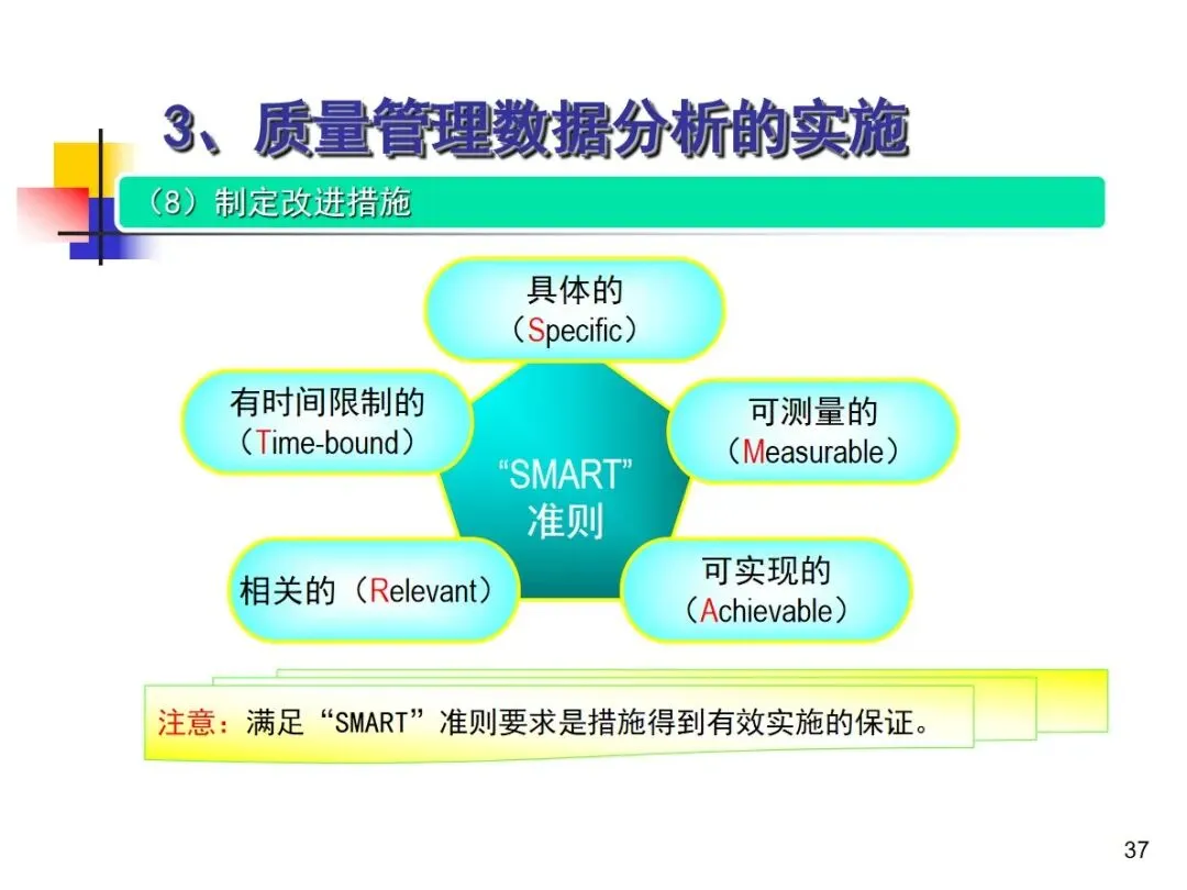 改进措施的制定要遵循 SMART原则,责任明确,目标明确,期限明确,针对问题的根源,切合实际,兼顾经济和可操作性。在执行中,要杜绝执行不到位、监督不到位的现象,对措施执行前后的质量问题发生率和损失情况进行对比,验证措施效果,如果措施不起作用,要从数据的真实性、分析原因、设计措施等方面进行反思和纠正;措施若有效,则应及时规范化,并纳入常规管理之中。