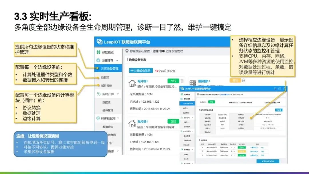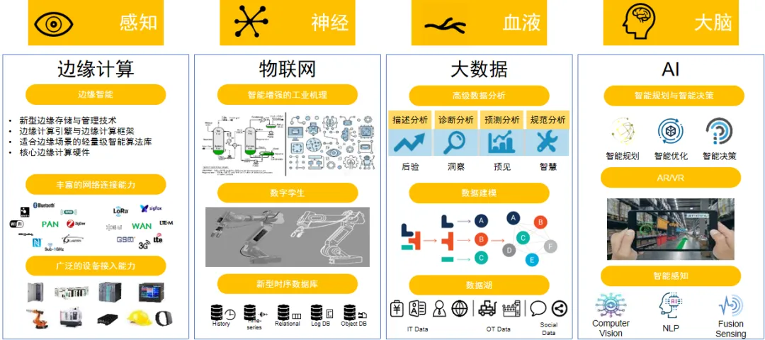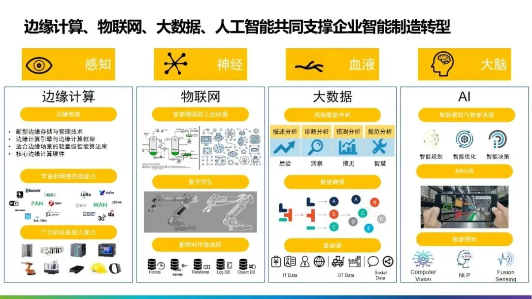 方案以边缘计算、物联网、大数据为基础技术支撑,搭配数字孪生、工业云平台、工业 AR/VR 等实用技术工具,搭建起覆盖设备接入、数据采集处理、智能分析应用的完整技术底座,实现工业设备的泛在连接、生产经营数据的全生命周期管理,让数据真正成为企业生产经营的核心要素。