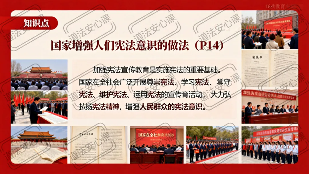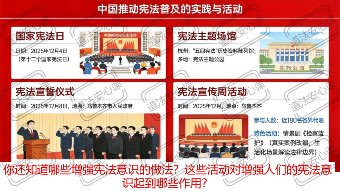 教师小结:国家层面:设立国家宪法日、建立宪法宣誓制度、建设宪法教育基地(如“五四宪法”历史资料陈列馆、宪法主题公园)