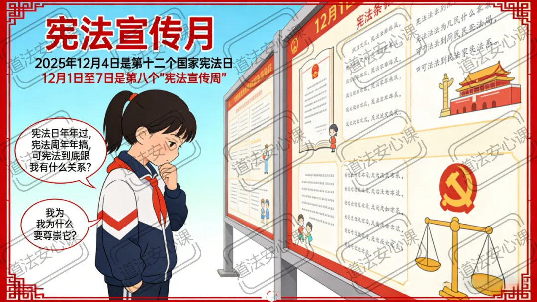 小宁的困惑,也是很多同学的困惑。今天这节课,我们就跟着小宁一起,走进宪法宣传月,寻找“尊崇宪法”的理由和行动指南。