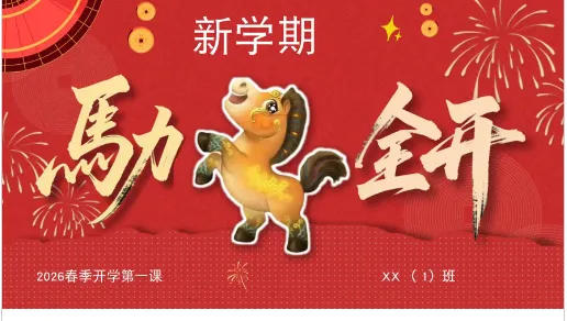 同学们,大家好!欢迎回到校园。看着大家一张张熟悉又充满朝气的脸庞,老师心里真的特别高兴。今天是2026 年的春季开学第一课,我们的主题是“新学期,马力全开”。这里的“力”,是努力的动力,是成长的活力,更是我们马年特有的“马力”。新的一年,希望我们每一位同学都能在这里积蓄力量,迎接新的挑战。让我们正式开启这充满希望的第一课!