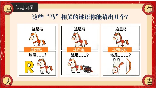 P5-P6大家看屏幕上的这些图片,都是和“马”相关的谜语。这些有趣的“马”相关的谜语,你能猜出几个呢?(开始猜谜互动)......希望通过这个小小的热身,能让大家的大脑迅速活跃起来,感受到马年的趣味。