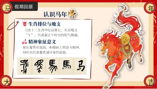 分享完趣事,我们要正式“认识马年”了。在中国传统文化中,马在十二生肖中位居第七,对应地支“午”,代表着正午时分的阳气鼎盛。这不仅是一个时间符号,更是一种精神象征。它象征着勇往直前、积极向上的奋斗精神,同时也代表着忠诚可靠的品格。了解这些文化背景,能让我们更好地汲取生肖背后的精神力量。