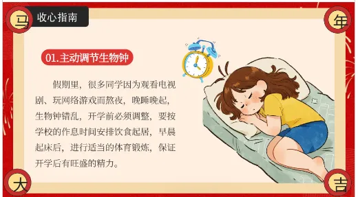 收心的第一步,是“主动调节生物钟”。假期里,很多同学因为观看电视剧、玩网络游戏而熬夜,晚睡晚起,生物钟错乱。开学前必须调整,要按学校的作息时间安排饮食起居。早晨起床后,进行适当的体育锻炼,保证开学后有旺盛的精力。身体是革命的本钱,好的睡眠和作息是我们高效学习的基础。