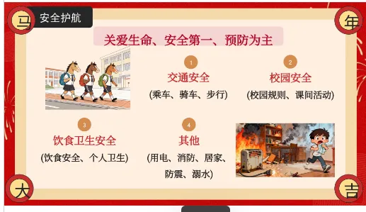 接下来,我们进入第三个篇章,“马上平安 - 安全护航”。无论学习多么重要,生命永远只有一次。这一部分,我们要把安全二字刻在心里。关爱生命、安全第一、预防为主,这是我们不变的准则。