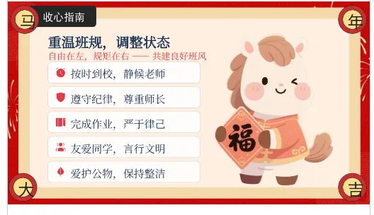 第二步,是“调整情绪,积极暗示”。如果你感到焦虑,试试这个"2 分钟情绪调节法”:首先是深呼吸放松,吸气 4 秒,屏息 7 秒,呼气 8 秒,重复 3 次。其次是情绪转移,摸新文具、看马年贴纸,转移负面注意力。最重要的是正视情绪不逃避,告诉自己“开学小焦虑很正常”,允许情绪流露,难过时可找老师、好友倾诉,或写在小纸条上释放情绪。