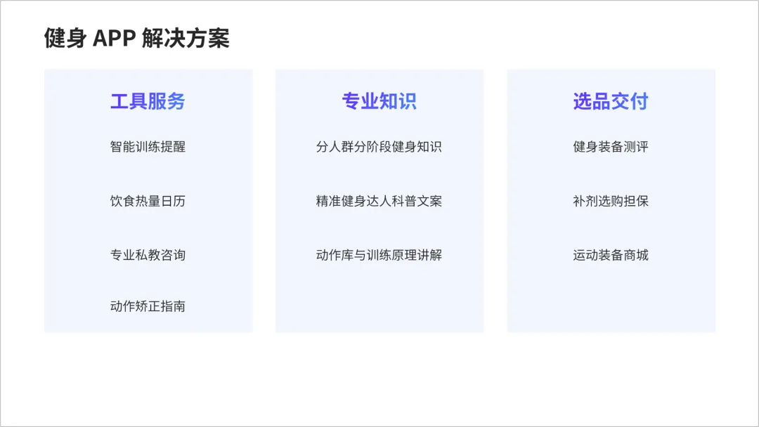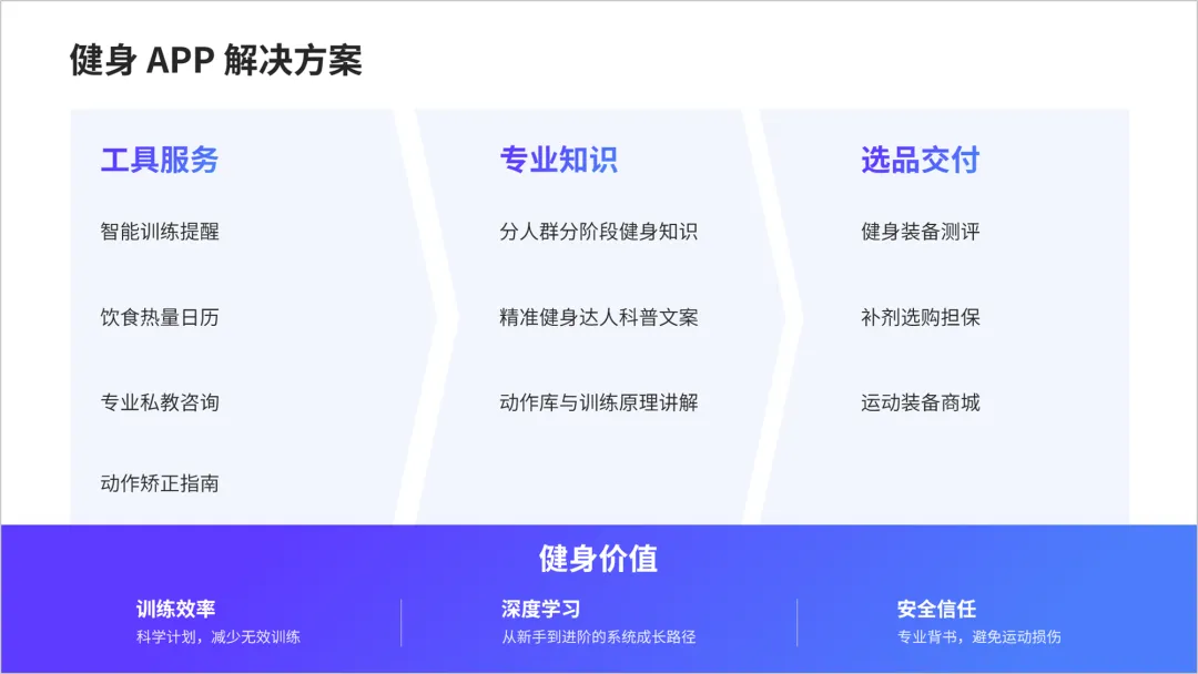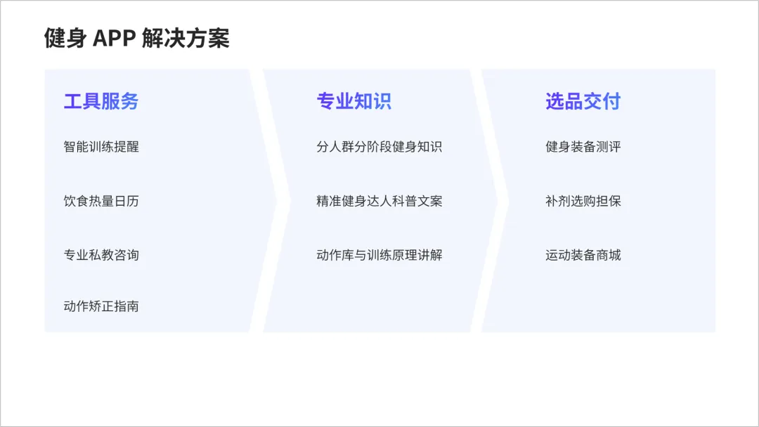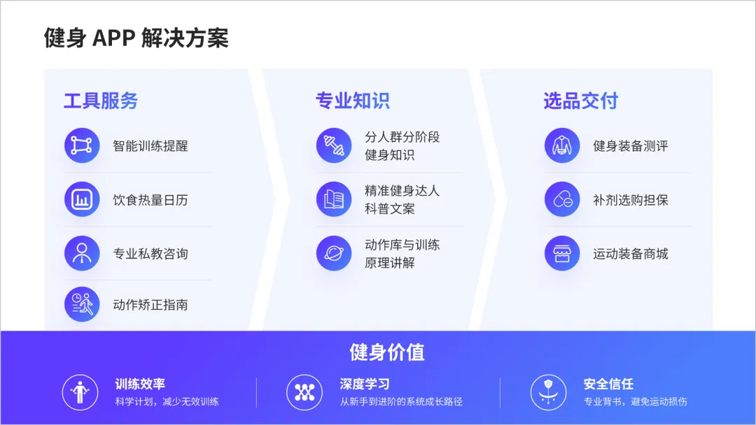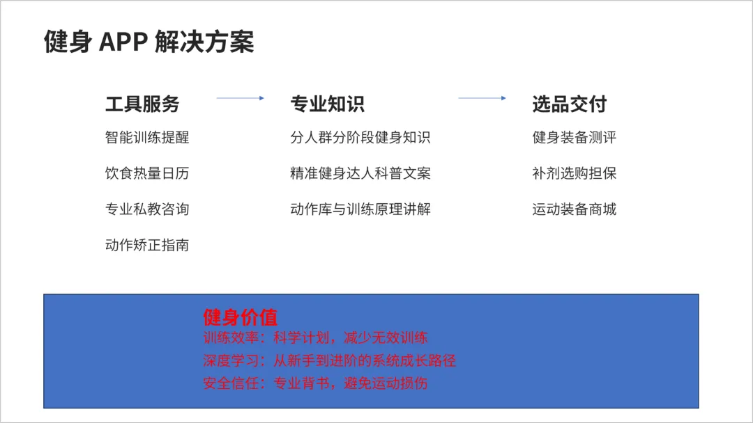 这是一页关于健身APP解决方案的流程图。但原稿制作得太普通,箭头指示也不明显。