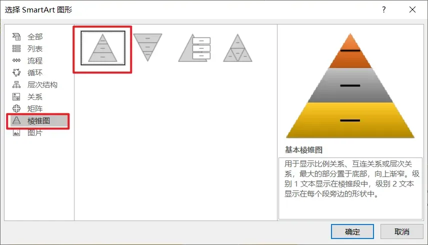 相较于其他复杂的排版,金字塔逻辑图不用刻意设计,最简单的方法就是打开PPT中的SmartArt,找到棱锥图,插入图形。