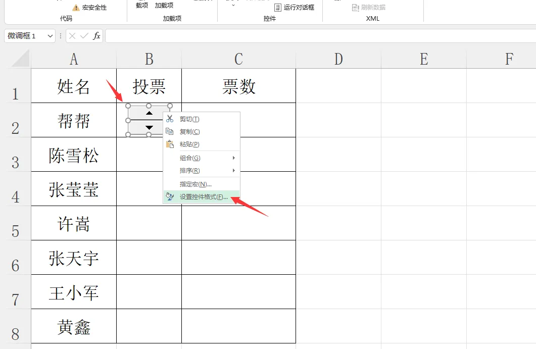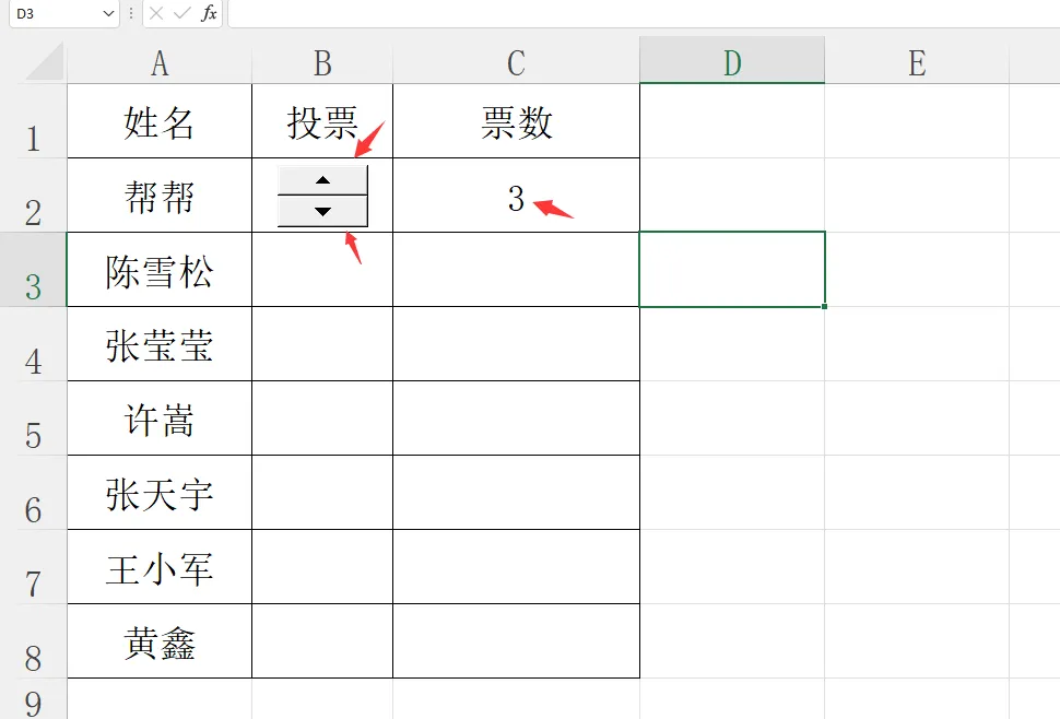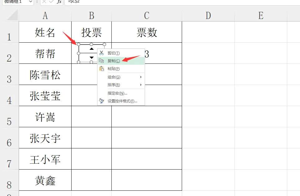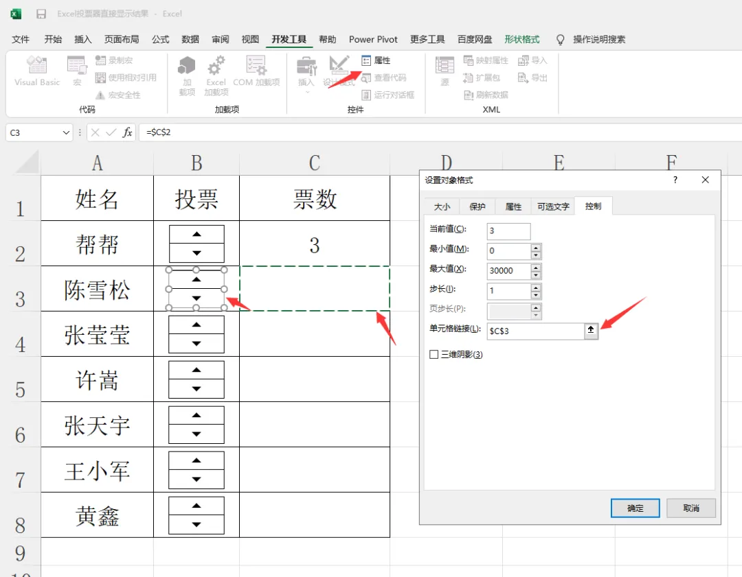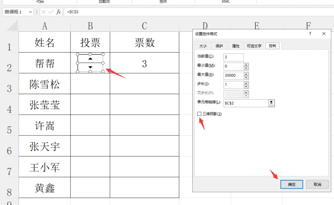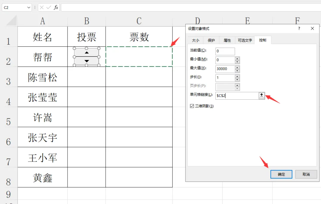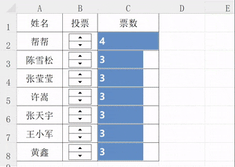 点击确定后,不妨尝试点击按钮的向上箭头,会发现C2单元格的数值增加了1;若不小心操作失误,点击向下箭头,C2数值则会减少1,计票功能就此成功实现。