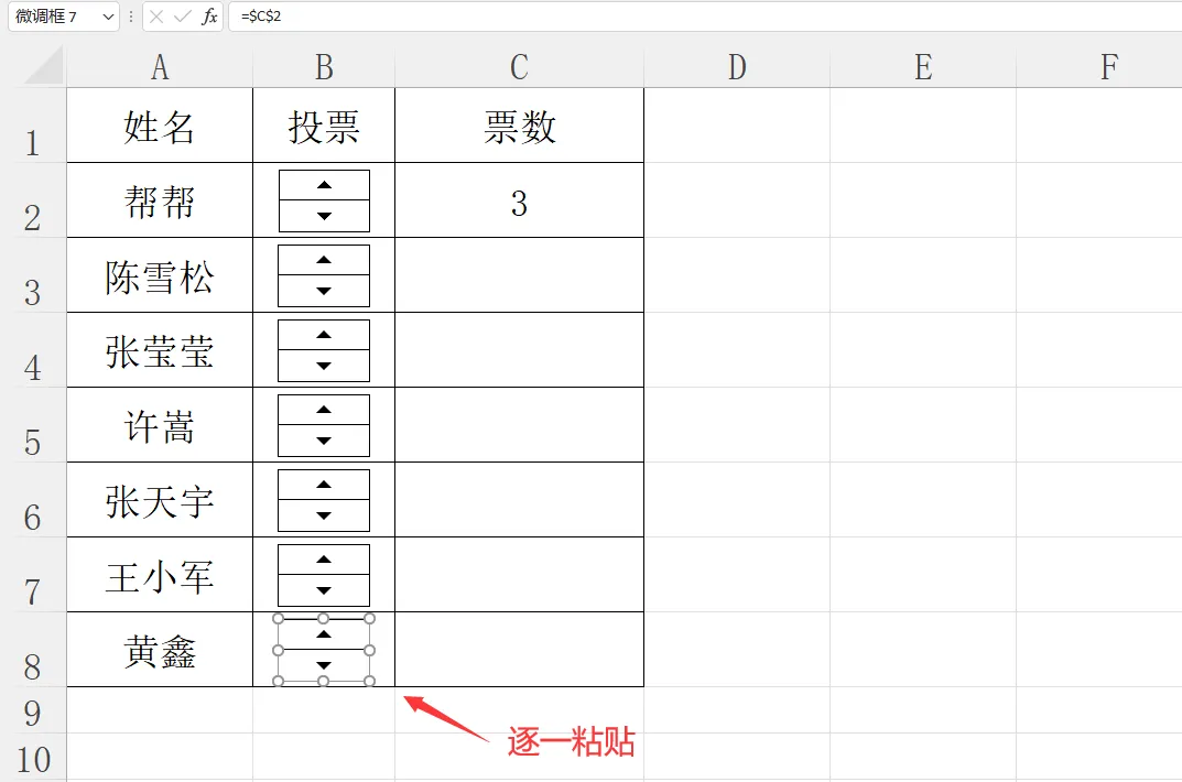 例如,B3单元格的按钮应链接到C3单元格,依此类推。如此操作后,每个按钮便能独立控制其对应的票数记录。