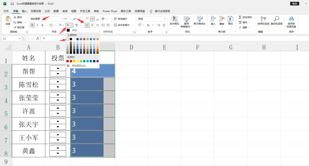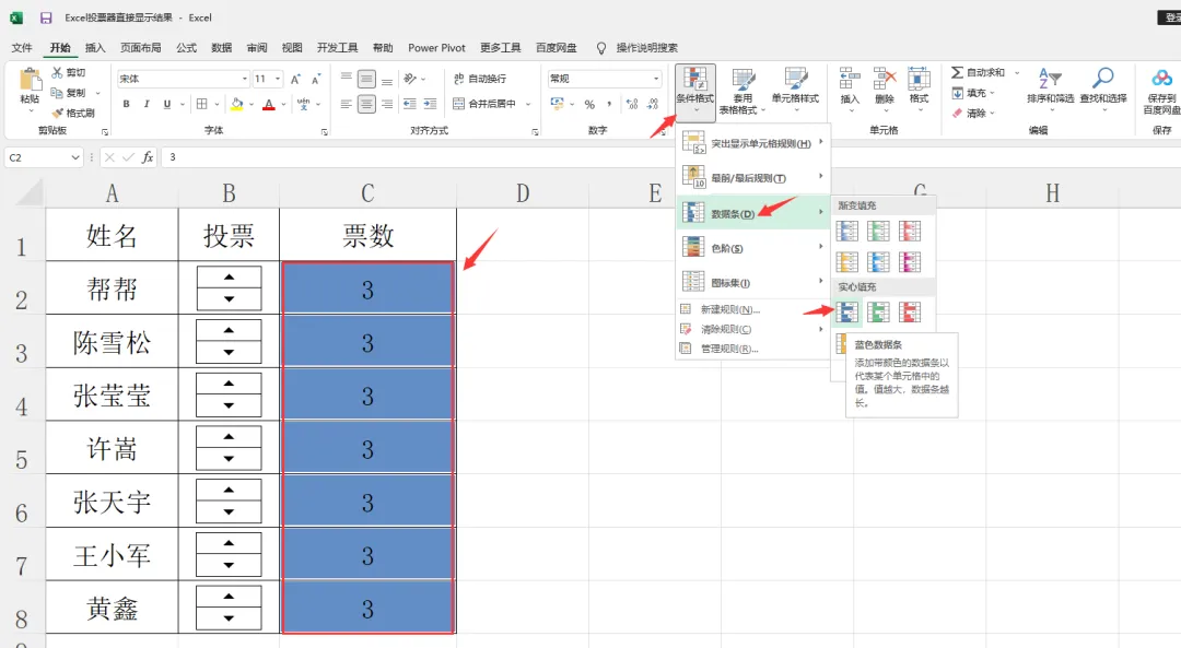这样,每个单元格的票数便会以进度条的形式呈现出来,票数越多,进度条越长,投票结果一目了然。