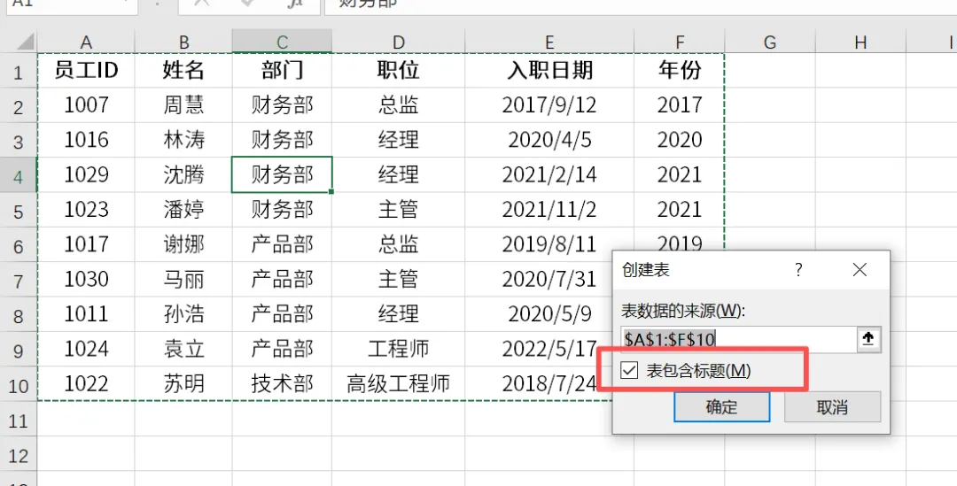 确认区域: 弹出窗口会默认选中你的数据区域,确认勾选“表包含标题”,点击【确定】。